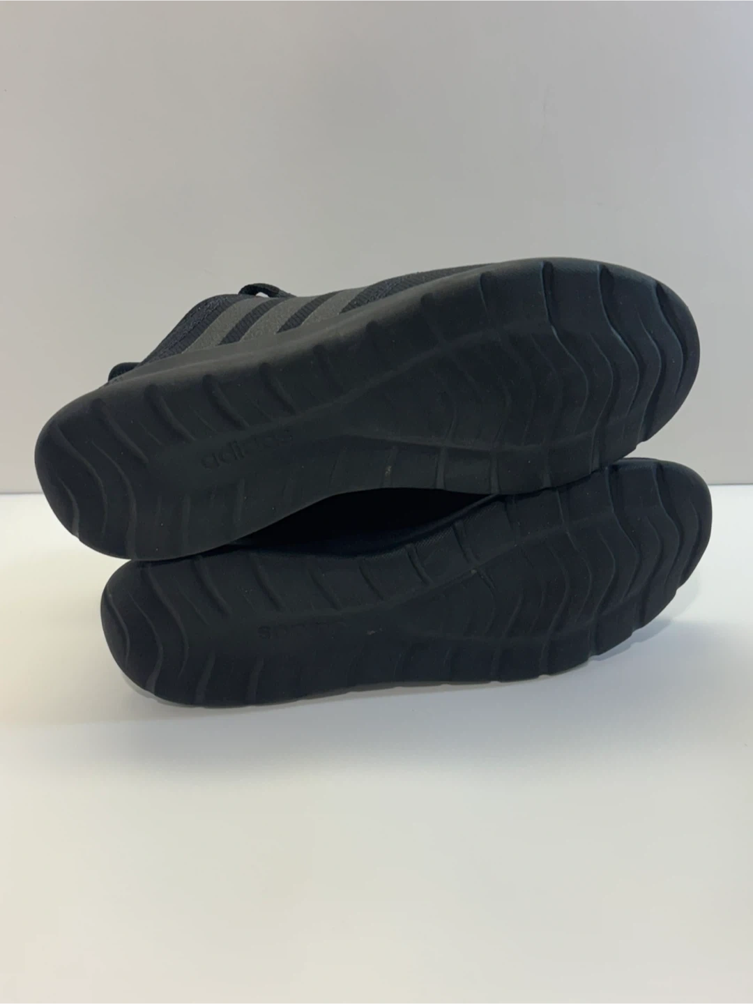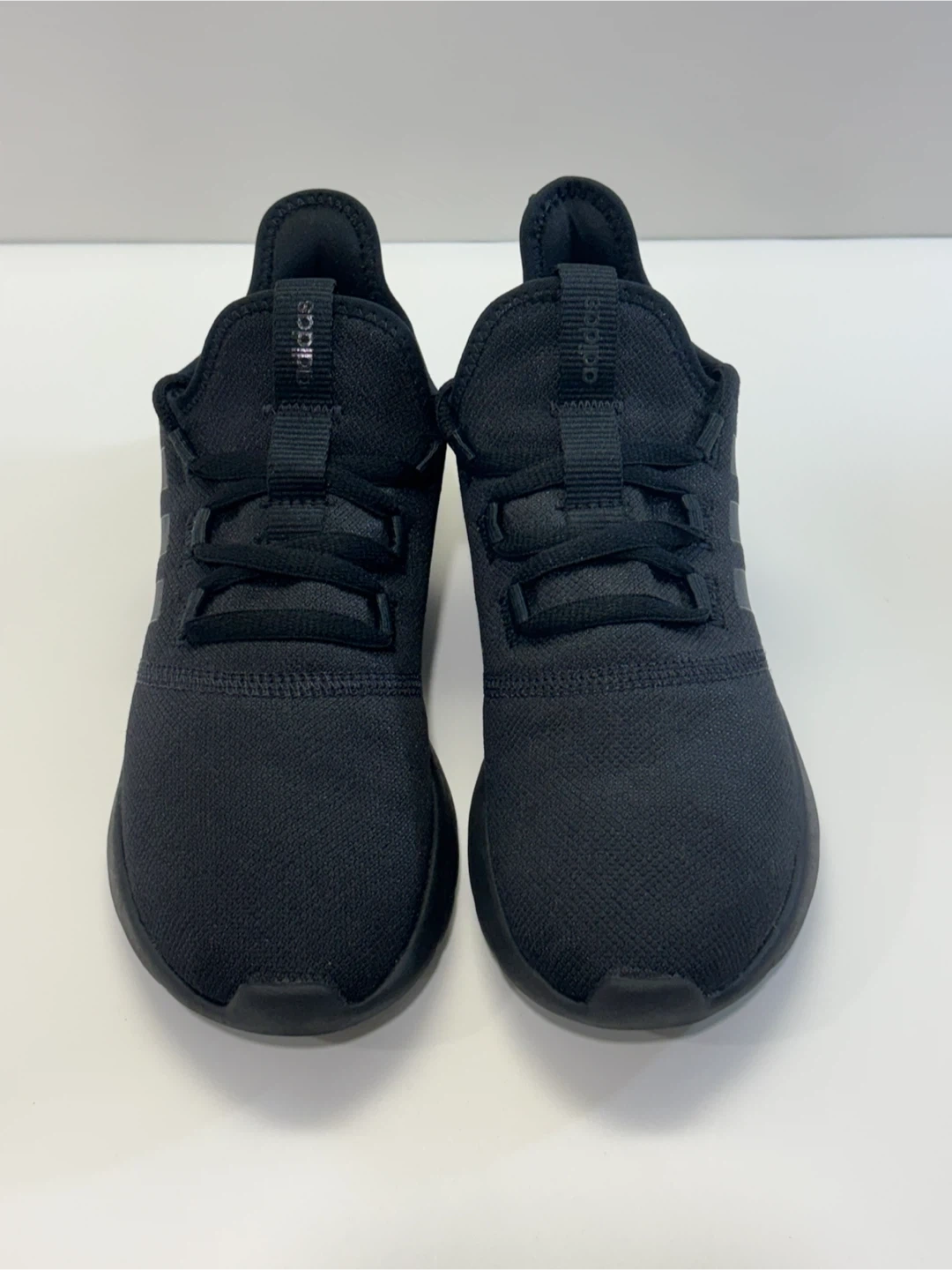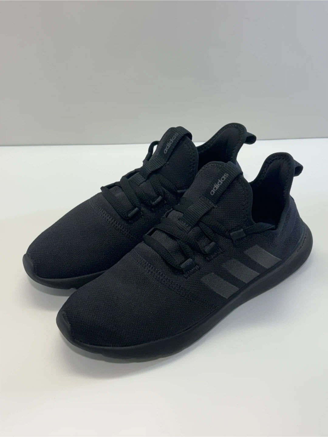 These are a pair of black Adidas running shoes. They feature Cloudfoam cushioning for comfort. Perfect for everyday wear or light athletic activities.