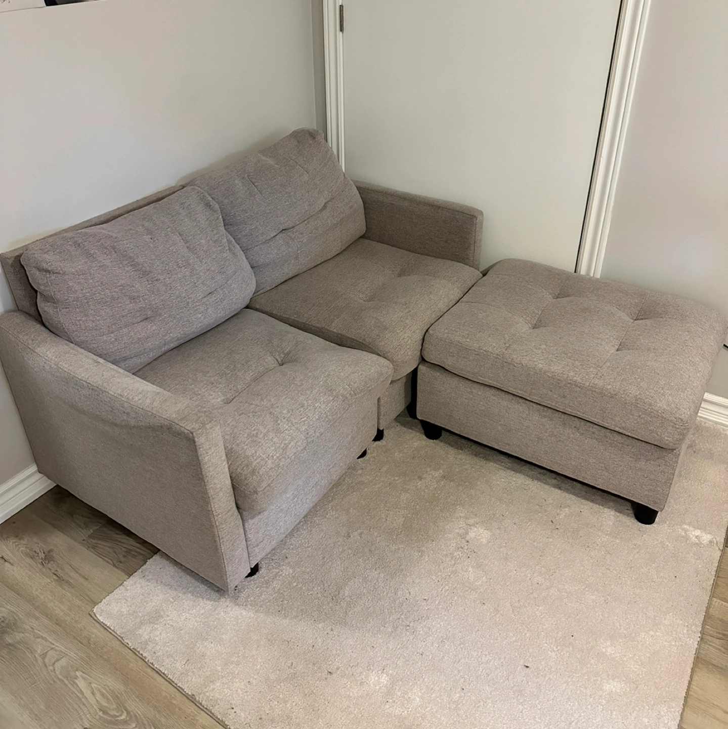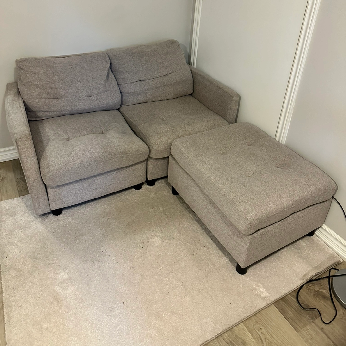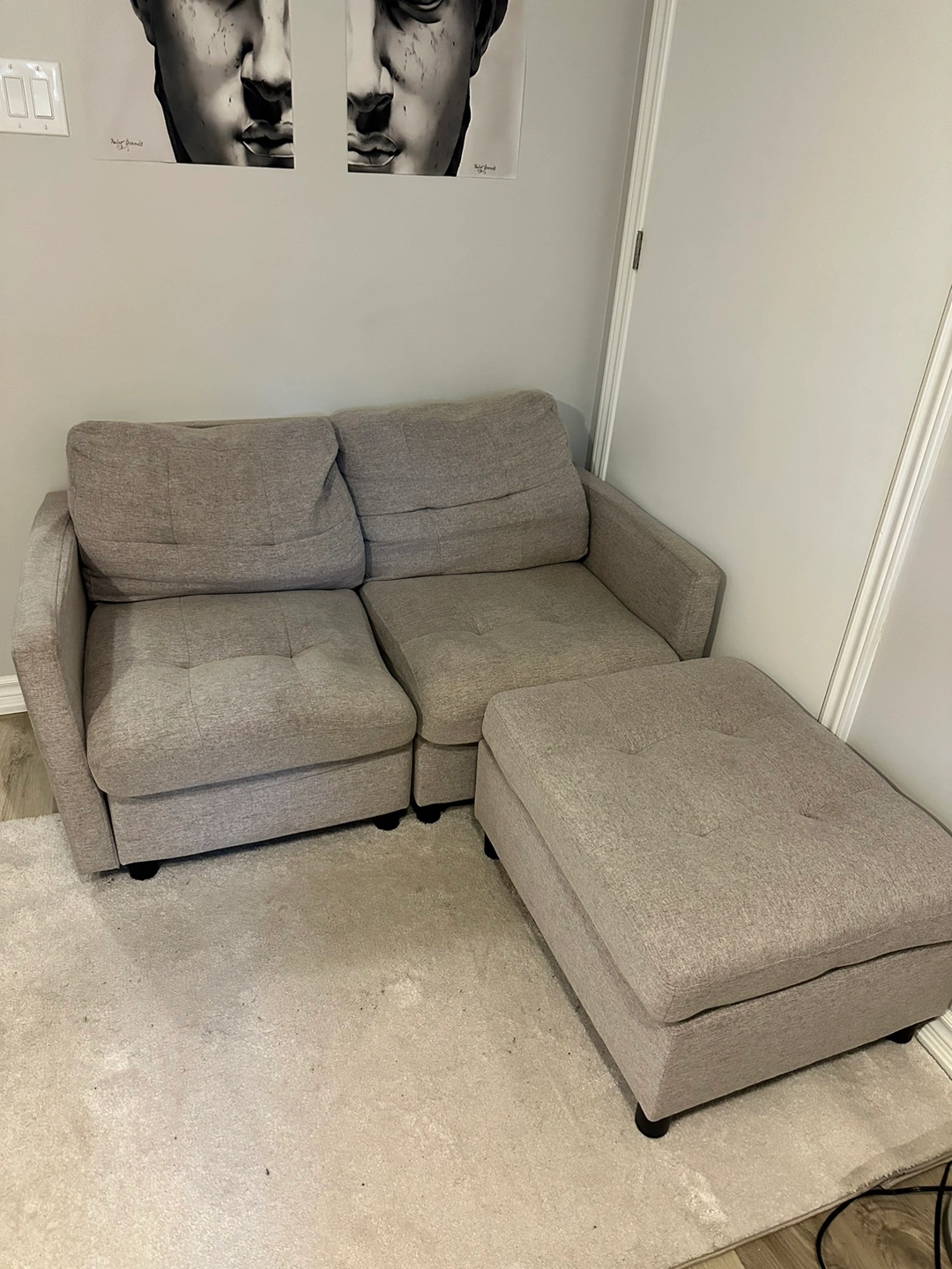 Selling our beloved 52-inch wide reversible modular sofa and chaise with ottoman. It's a stylish grey color and has been gently used for two years in a non-smoking, pet-free household. The sofa is in excellent condition with no tears or odors.