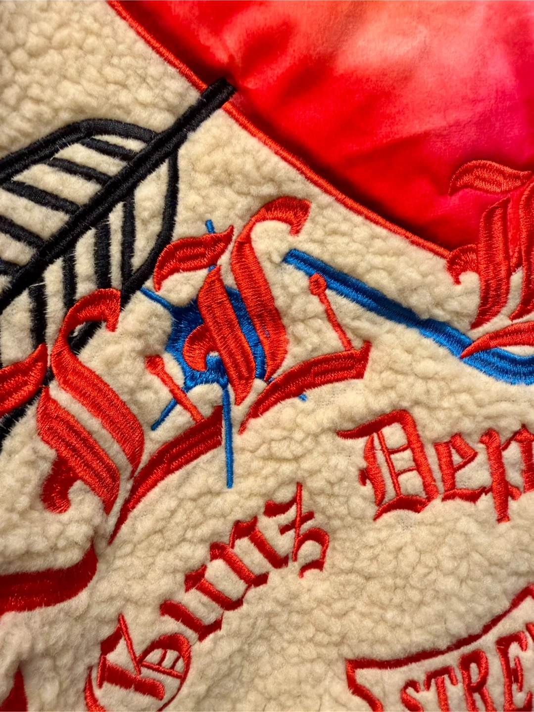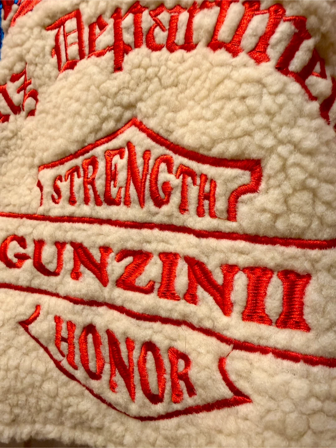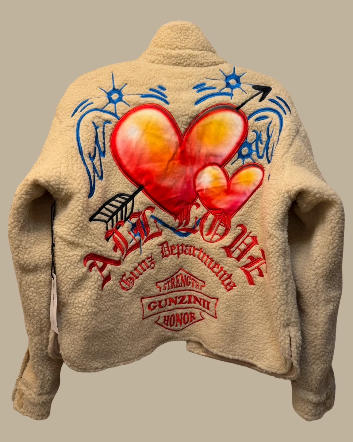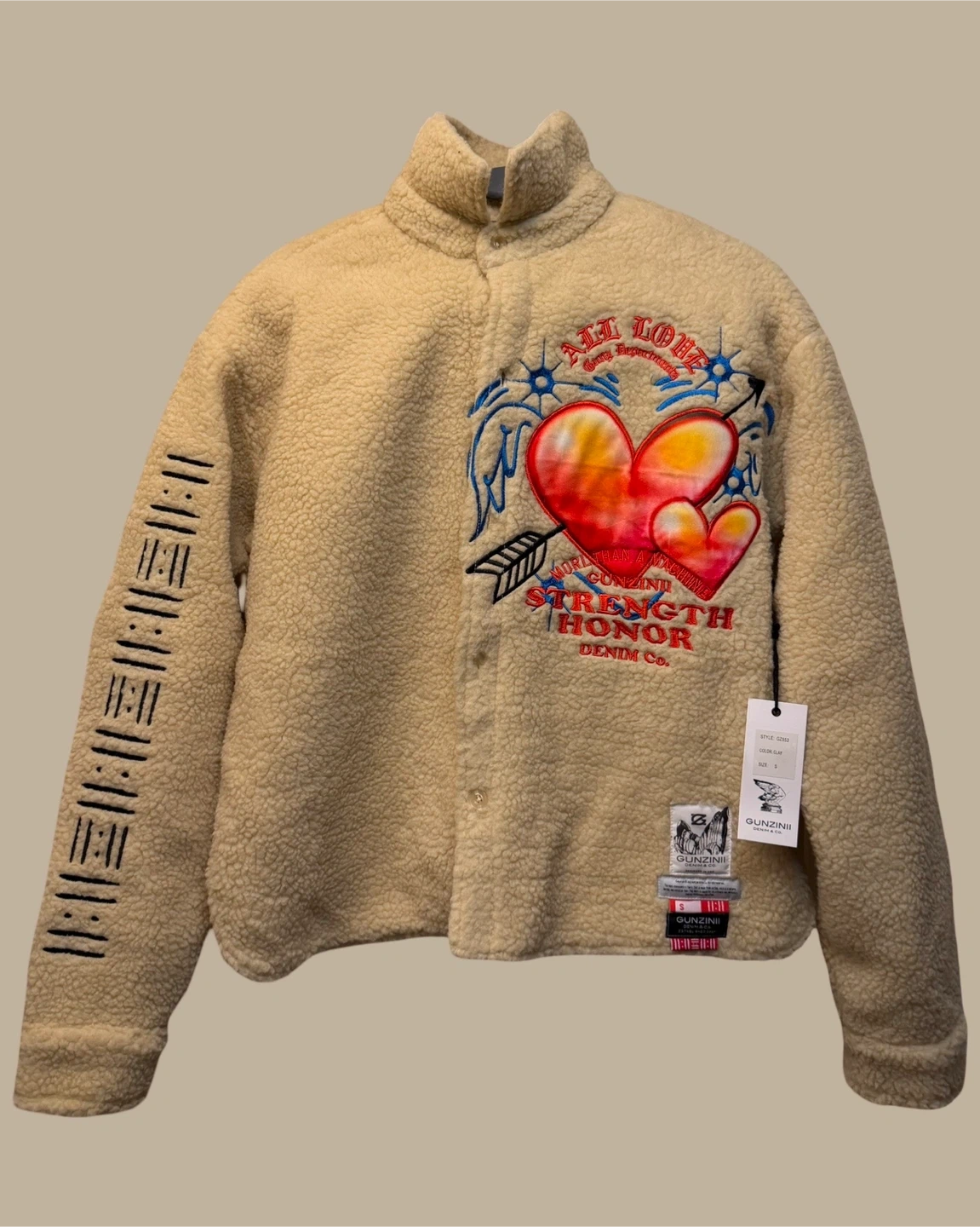 This GUNZINI HONOR jacket is made from soft sherpa fleece. It features embroidered hearts with an arrow design on the front and back. The jacket has a full zip closure and a stand-up collar. Made for durability and style!