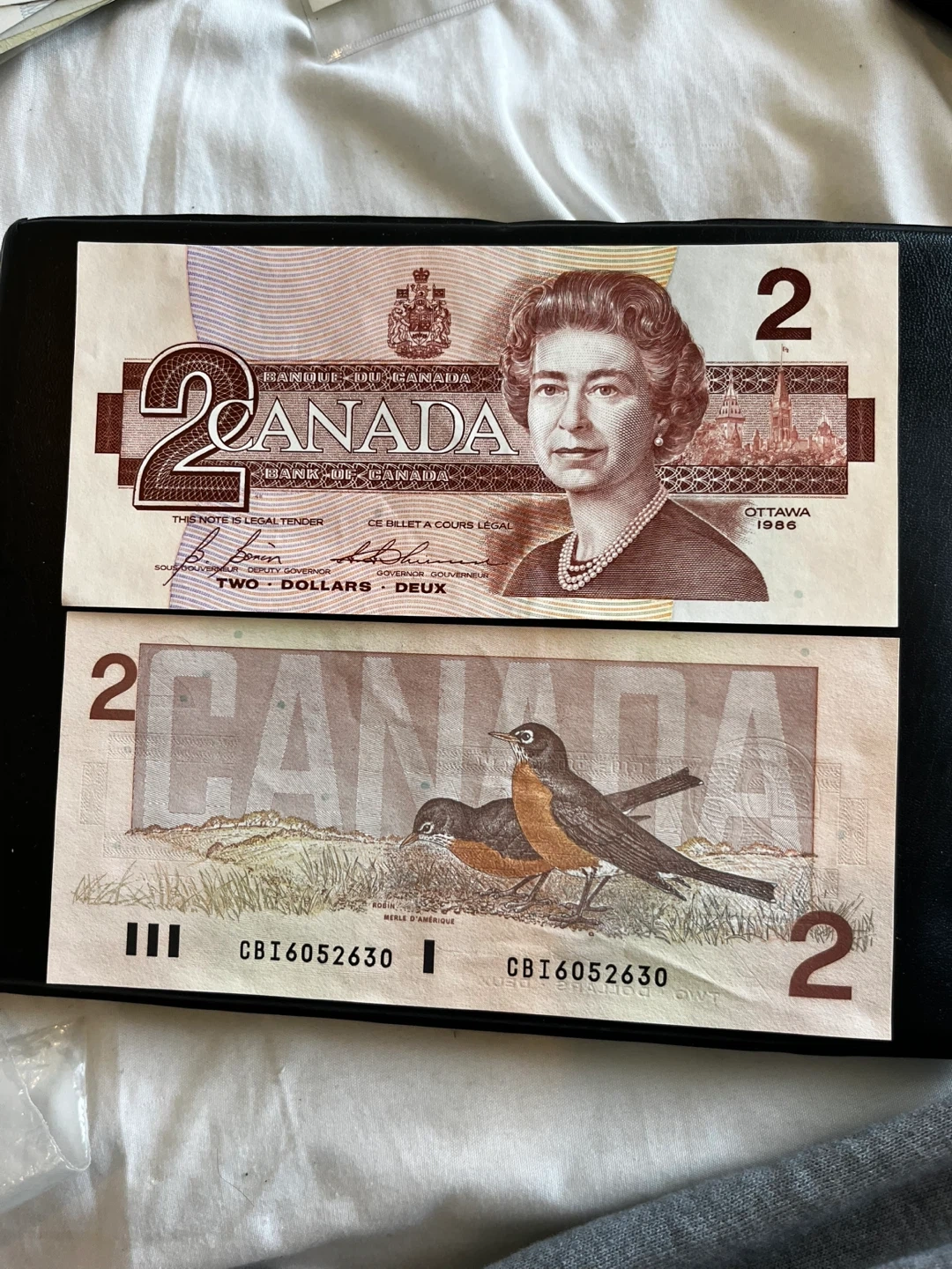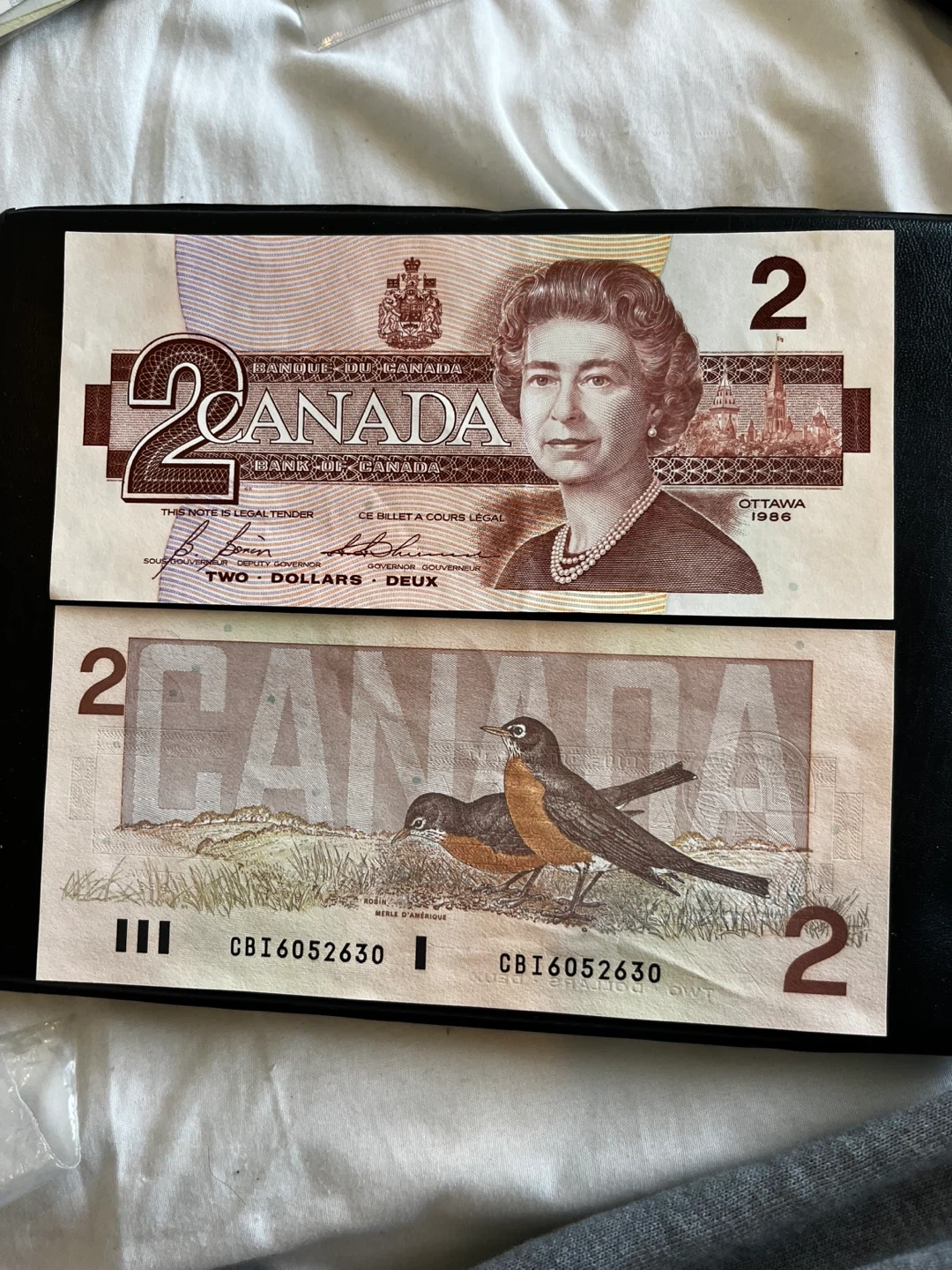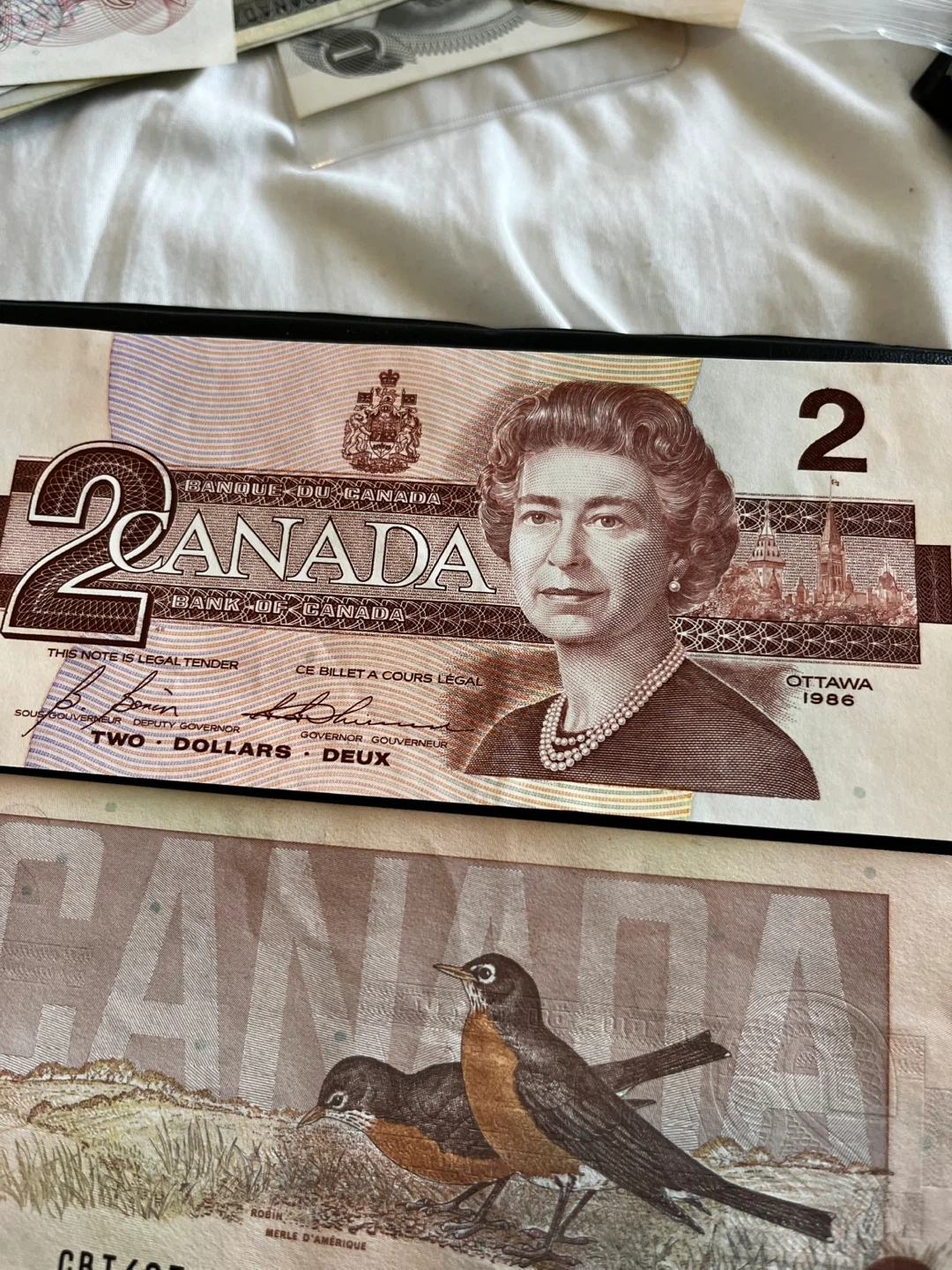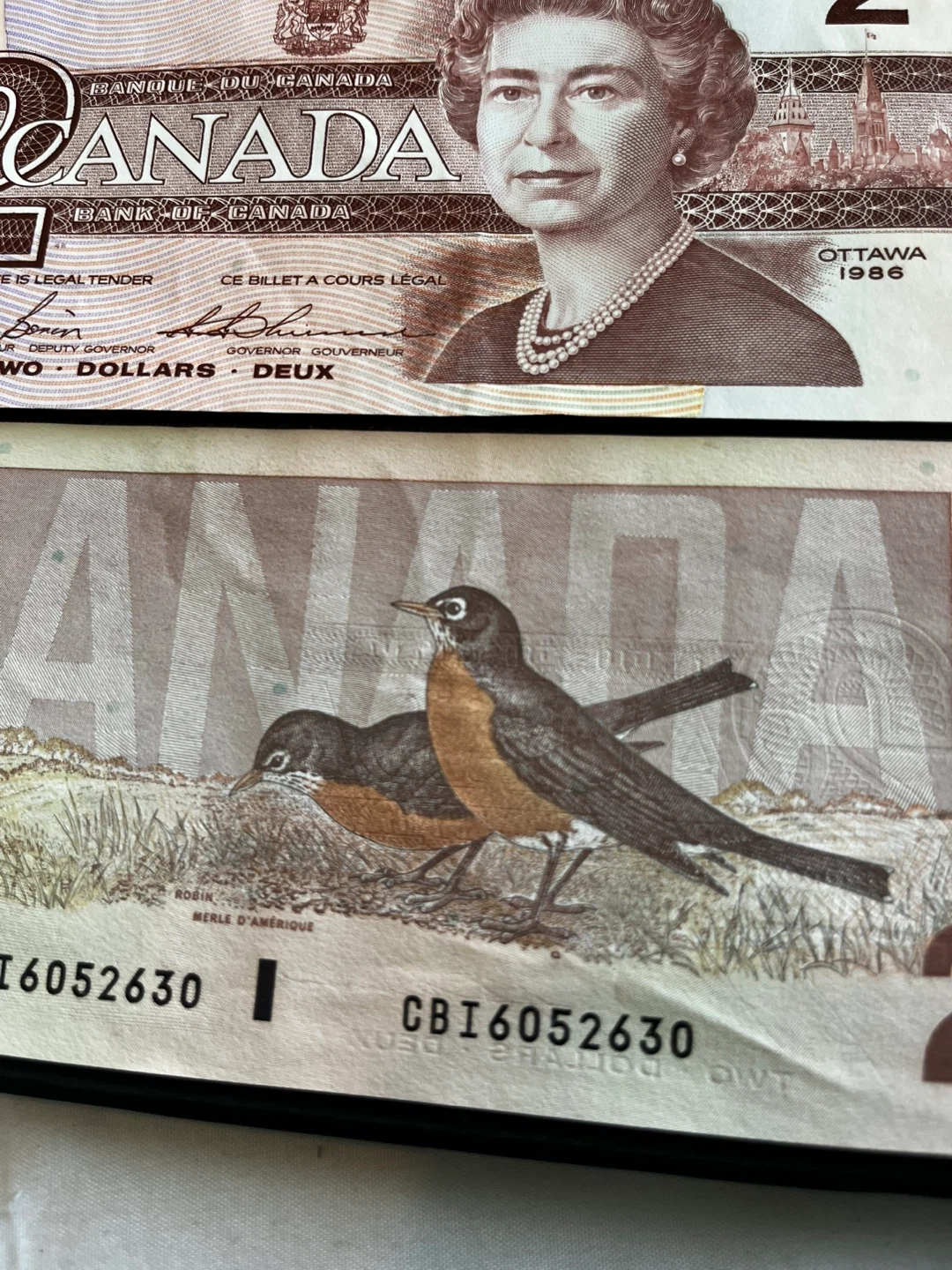 This image features a 1986 Canadian two-dollar banknote from the "Birds of Canada" series, which features a portrait of Queen Elizabeth II on the front and two American robins on the back. Two Canadian $2 bills from 1986. Features Queen Elizabeth II on the front and robins on the back. Ottawa 1986 printed on the front.