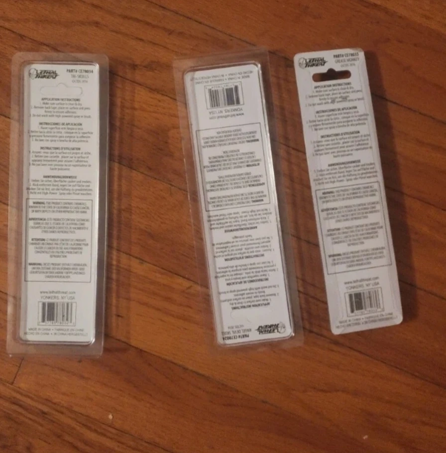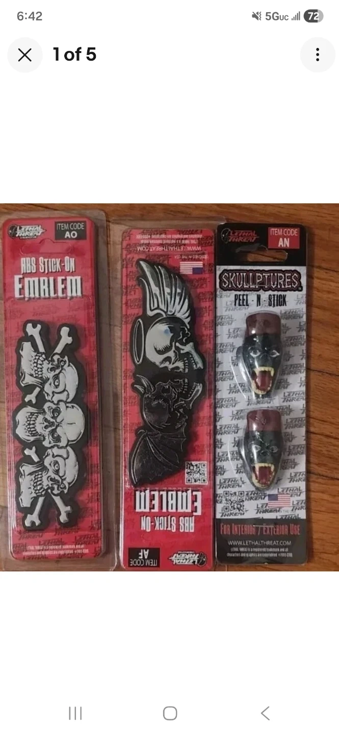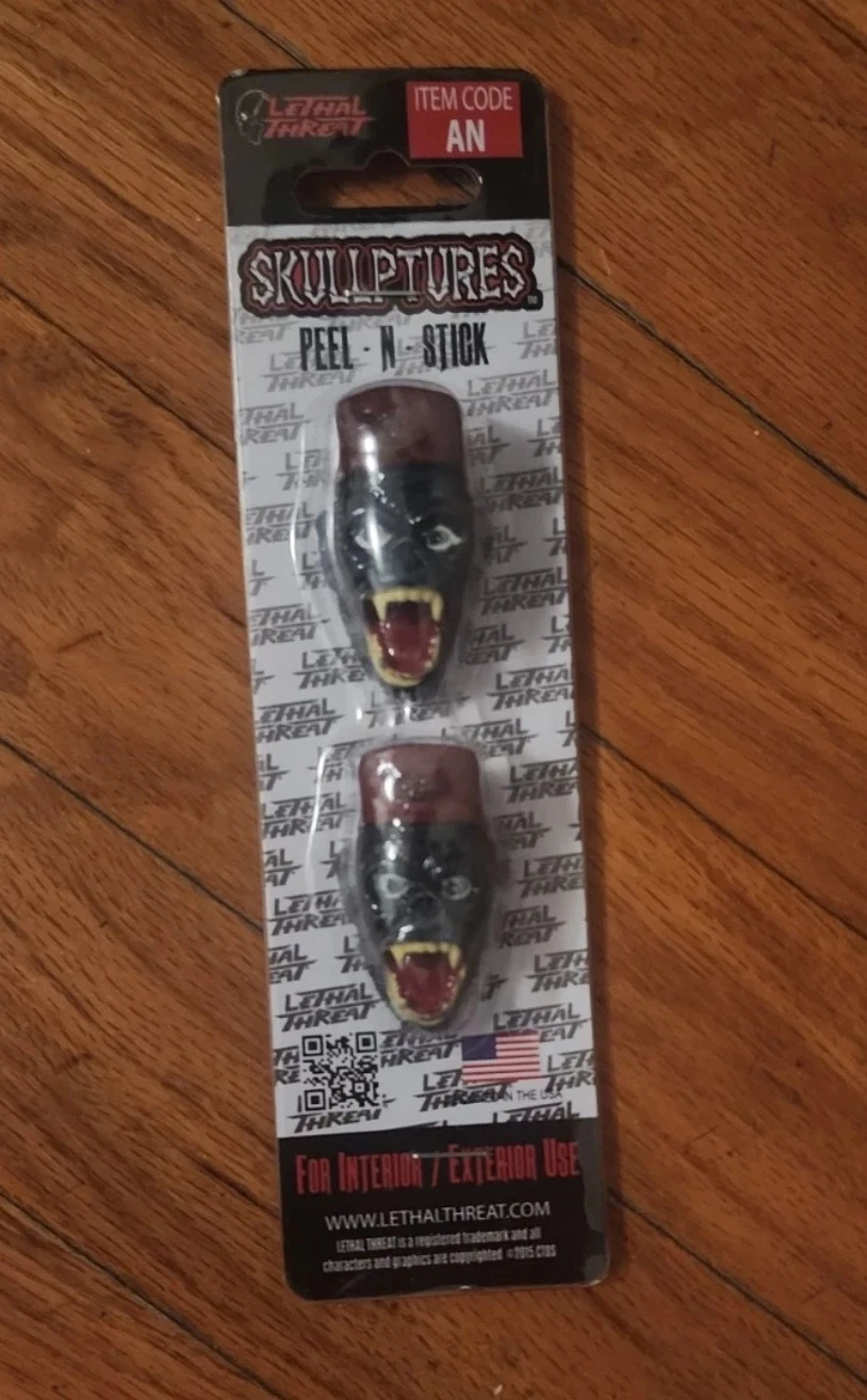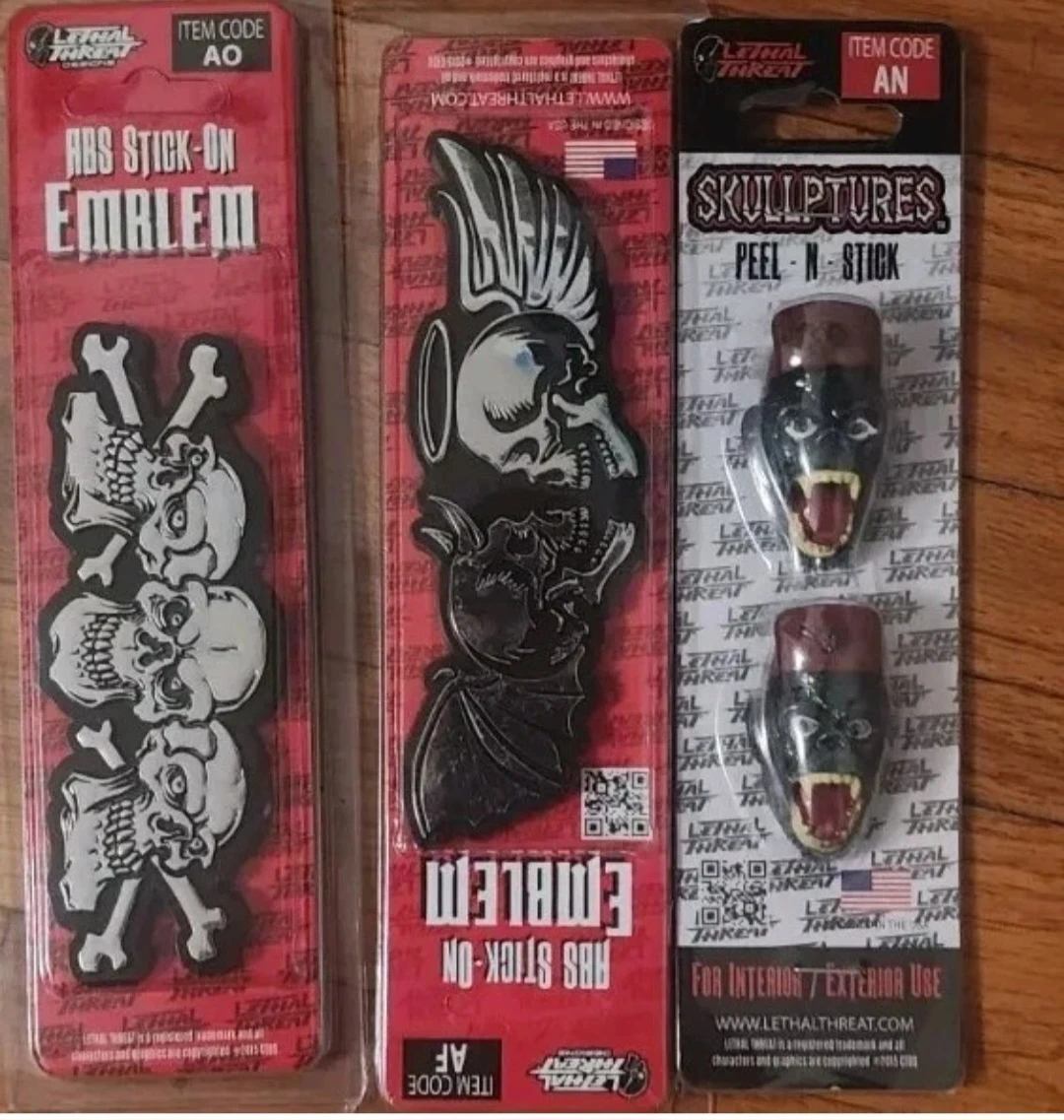 This listing includes a Lethal Threat ABS Stick-On Emblem featuring stacked skulls and bones. It also includes two Lethal Threat Skullptures Peel-N-Stick decals of monstrous faces. Both are designed for interior or exterior use. These are new in original packaging.