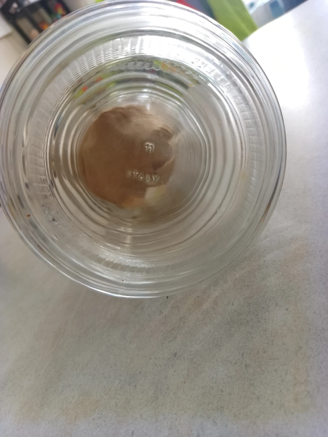 This clear glass pitcher has a textured ribbed design. Made in Italy. It's great for serving beverages or as a decorative vase.