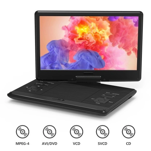 14" portable DVD player has a 180° rotating and 90° flipping eye protection screen, the resolution can reach 1280x800, TFT/LCD widescreen high contrast display, it is very suitable to put on the car seat, giving you an excellent visual experience.