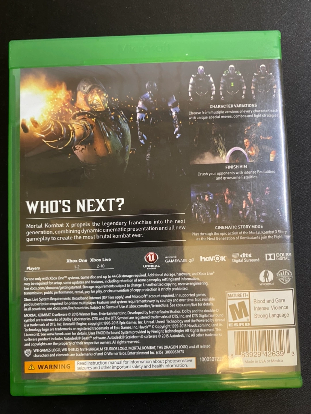 Xbox One game. Rated M for Mature. Features cinematic story mode and online interactions. Includes character variations and unique moves.