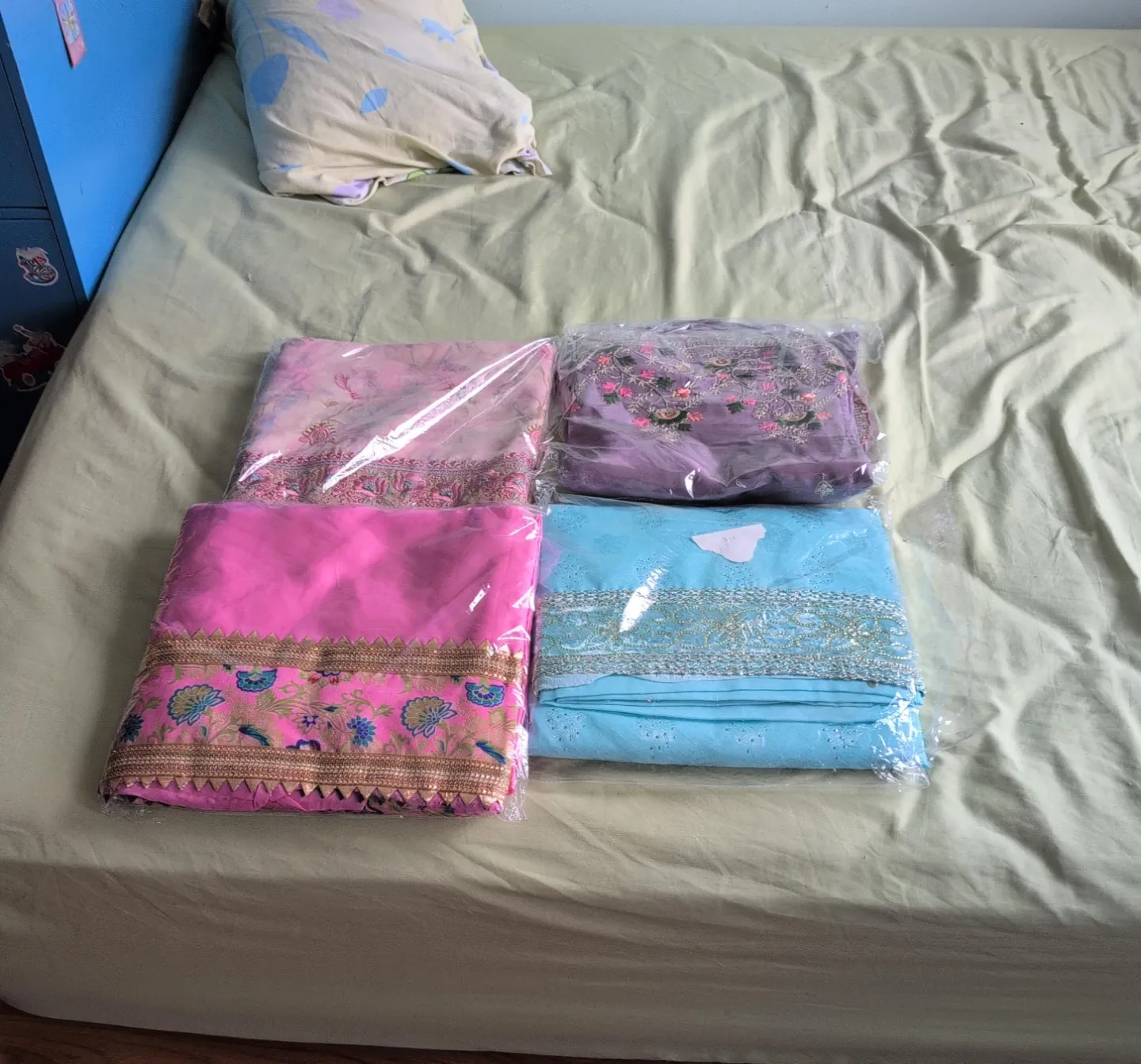Four lovely Pakistani salwar kameez sets. Various colours including pink, purple, and light blue. Intricately embroidered with matching dupattas. Ready for your next event!