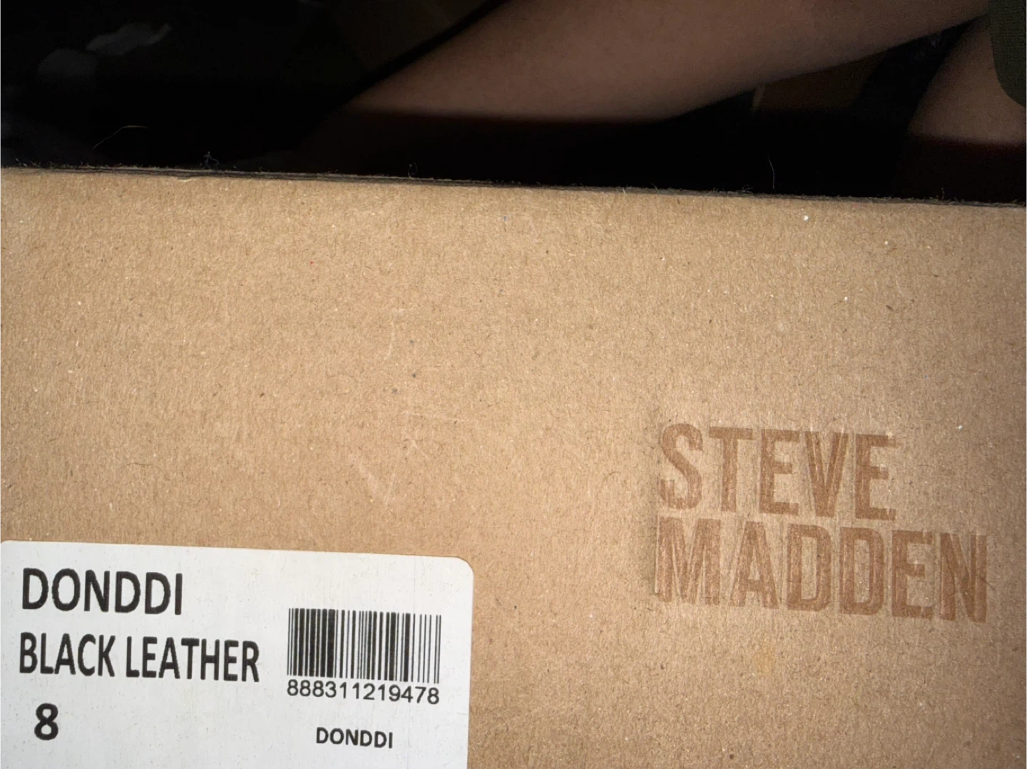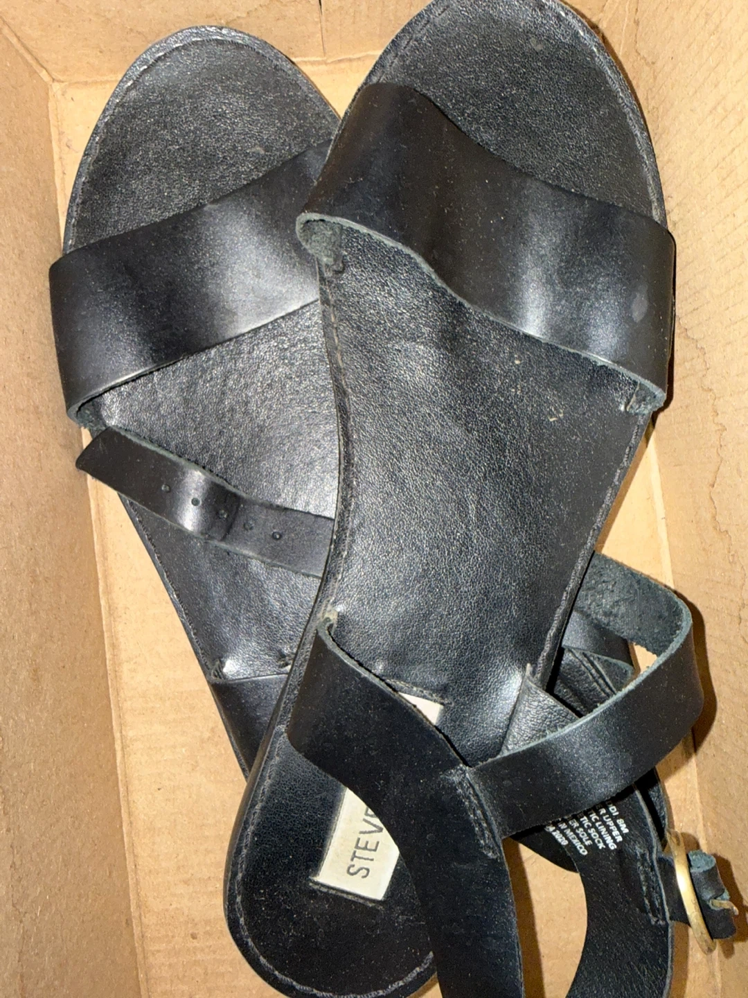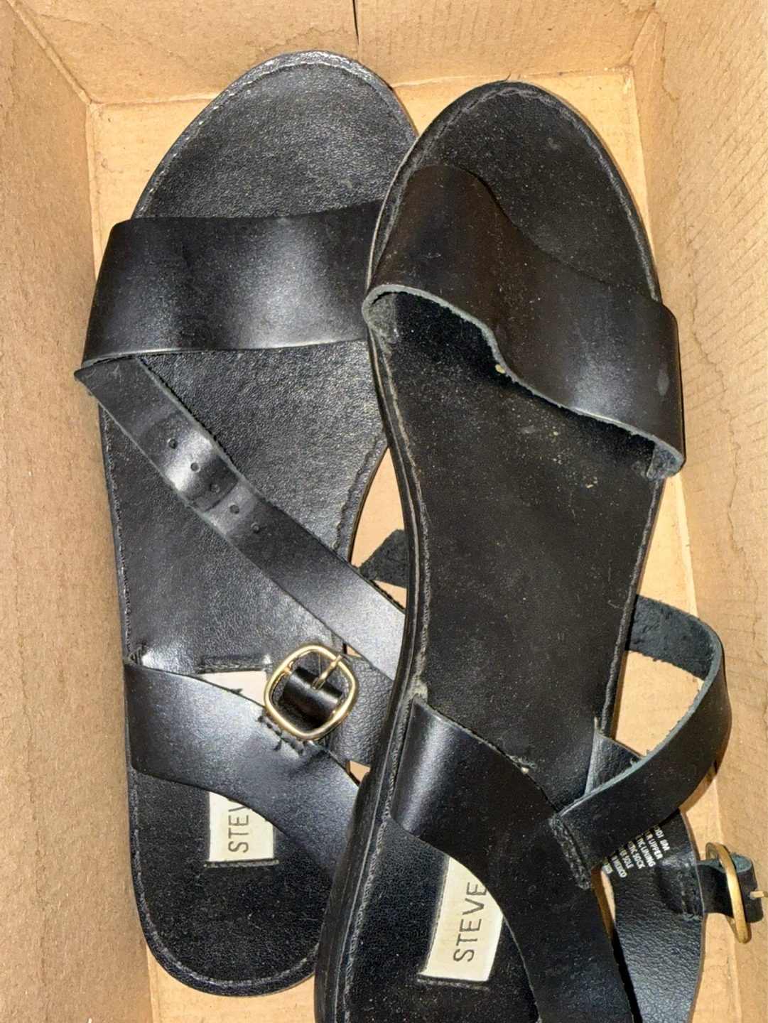 Black leather sandals by Steve Madden. Style name is Donddi. Comes in original box.