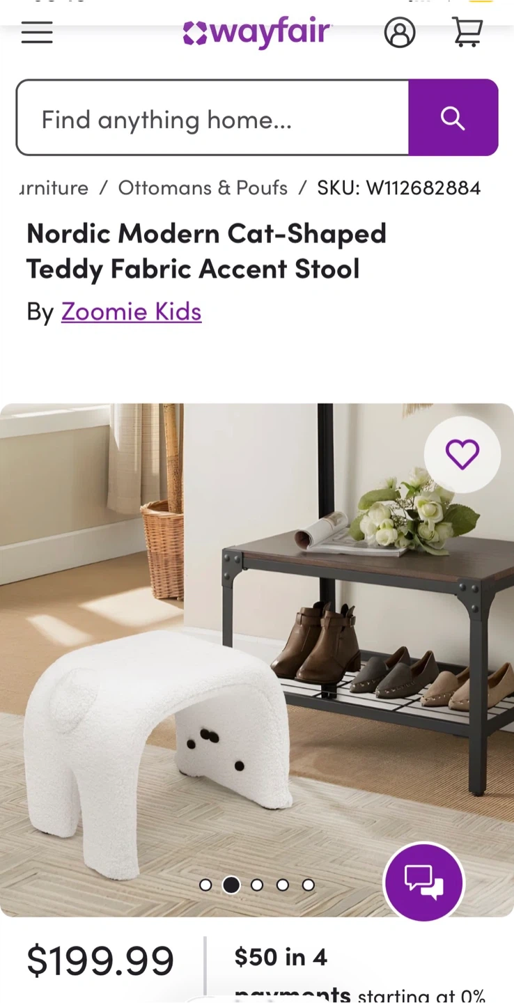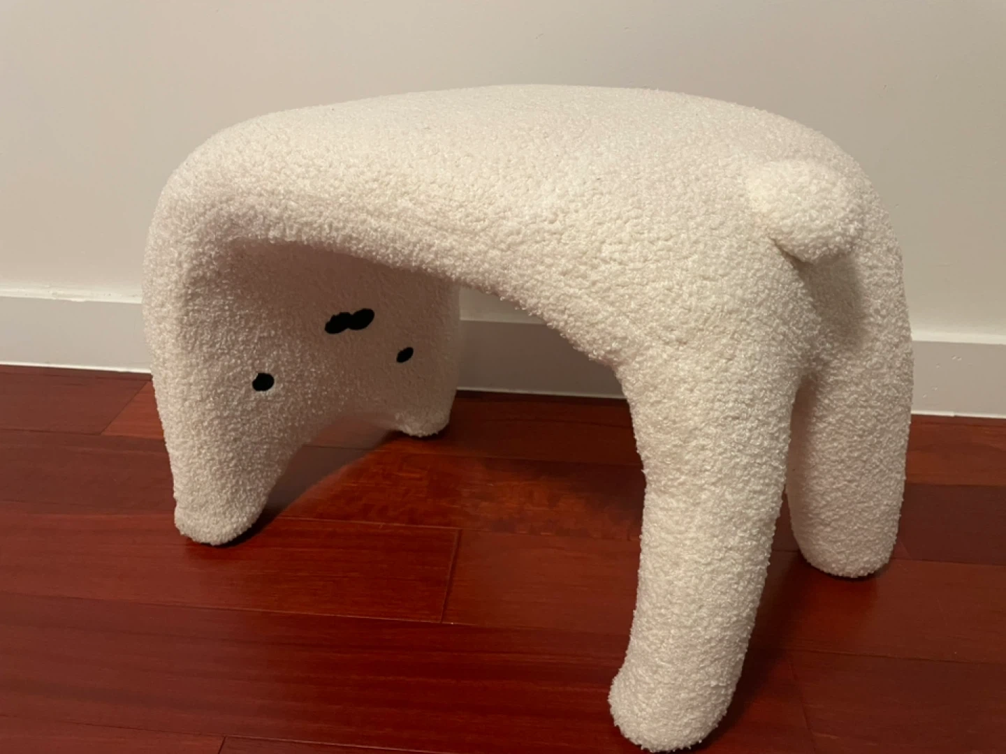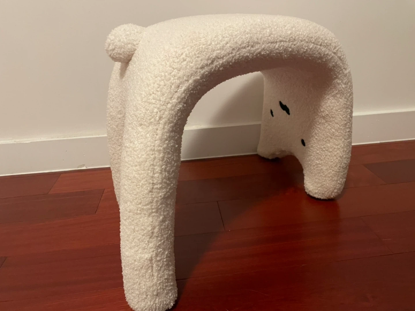 Nordic Modern Teddy Fabric Accent Stool by Zoomie Kids. It's a white, cat-shaped accent stool with a teddy fabric cover. This stool's unique design makes it a fun addition to a child's room!