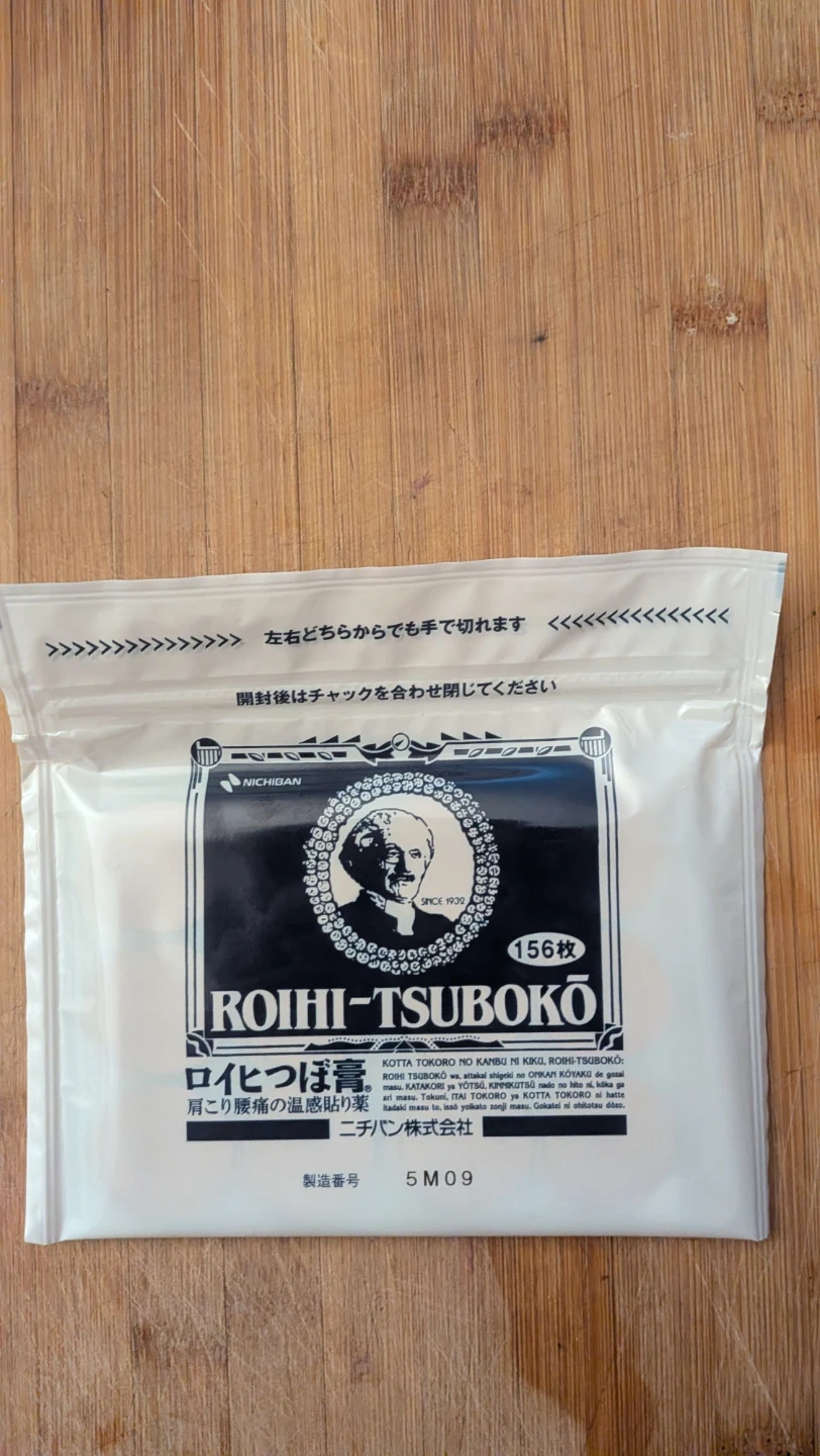 Nichiban Roihi-Tsuboko heat-feeling medicated patches for shoulder and lower back pain. Contains 156 patches. Provides warmth to the affected area.