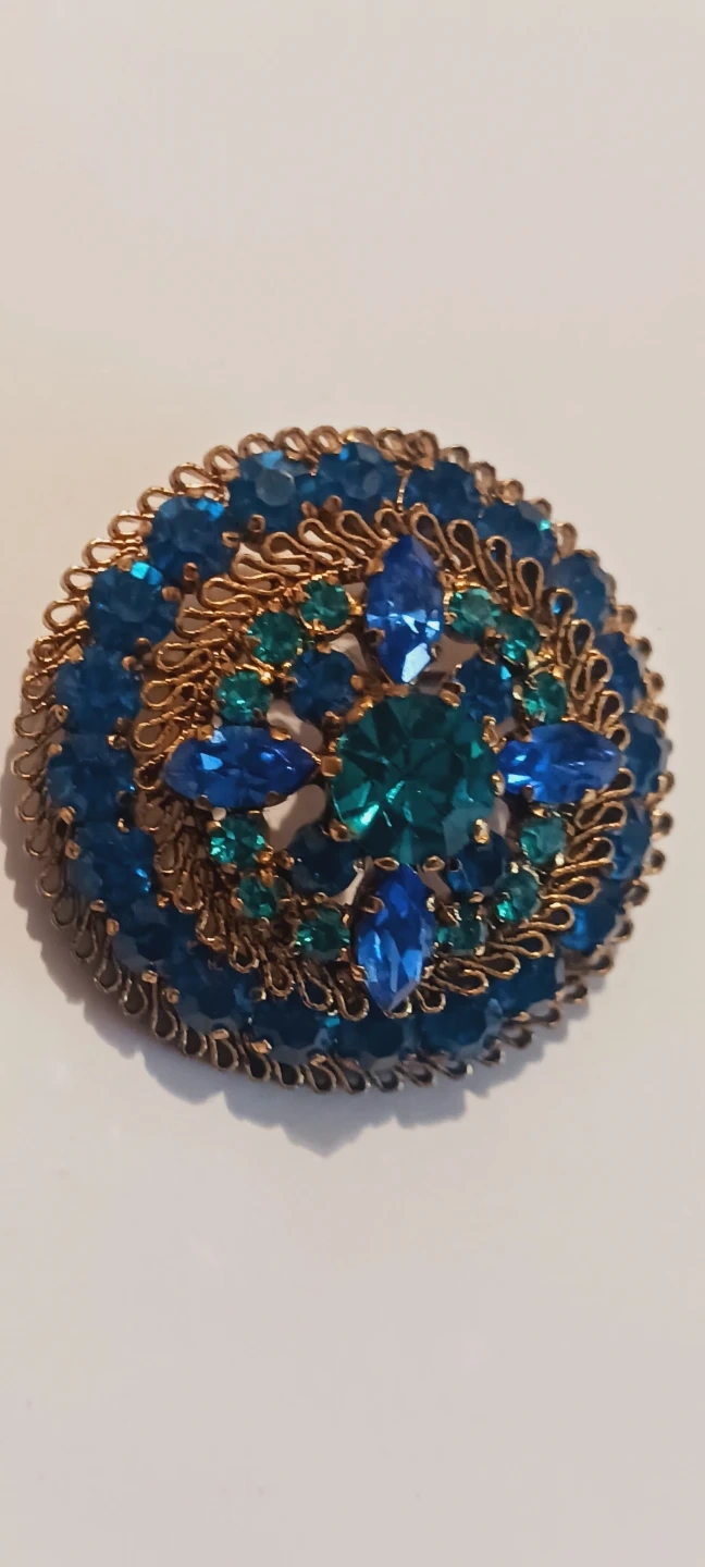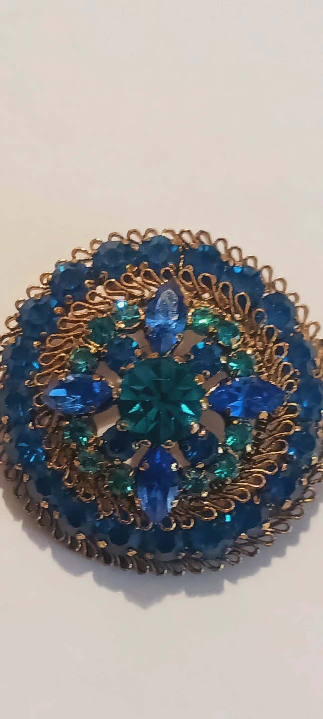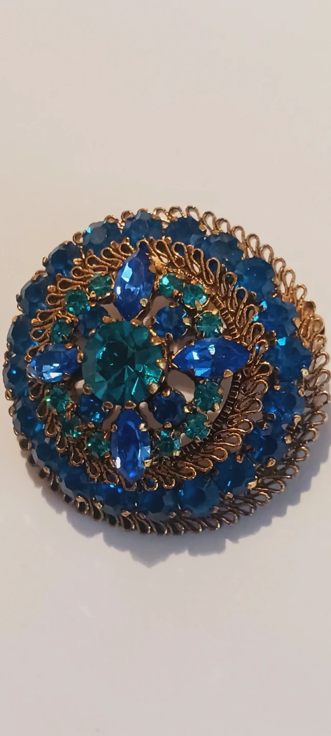Absolutely Gorgeous Vintage Genuine Austrian Signed "Austria" Austrian Blue Crystals Flower Shaped Brooch with beautiful ornate gold-tone metalwork. Features a dazzling arrangement of different shades of blue and teal rhinestones, including marquise and round cuts. Marked 'Austria'. ABSOLUTELY GORGEOUS ADDITION TO YOUR VINTAGE JEWELRY COLLECTION !!! 1.5" DIAMETER. EXCELLENT CONDITION. ALL MY PRICES ARE NEGOTIABLE !!