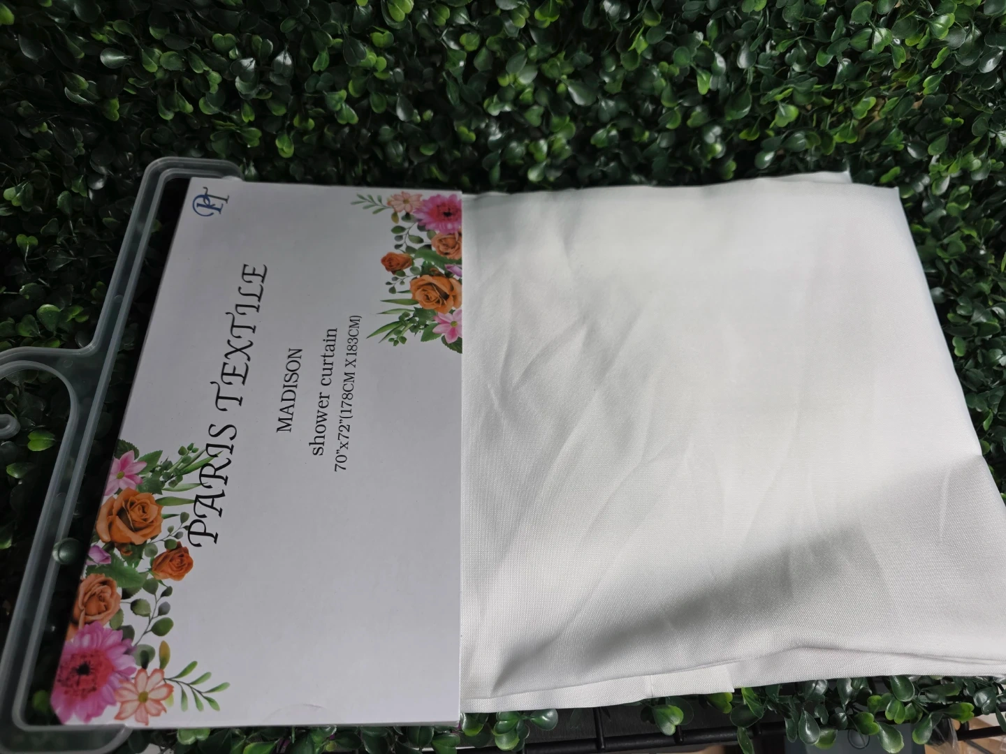 This is a Paris Textile Madison shower curtain. It's white and measures 70"x72" (178cm x 183cm). Made of 100% polyester. Care instructions: machine wash or by hand in cool water; hang dry. Do not iron.