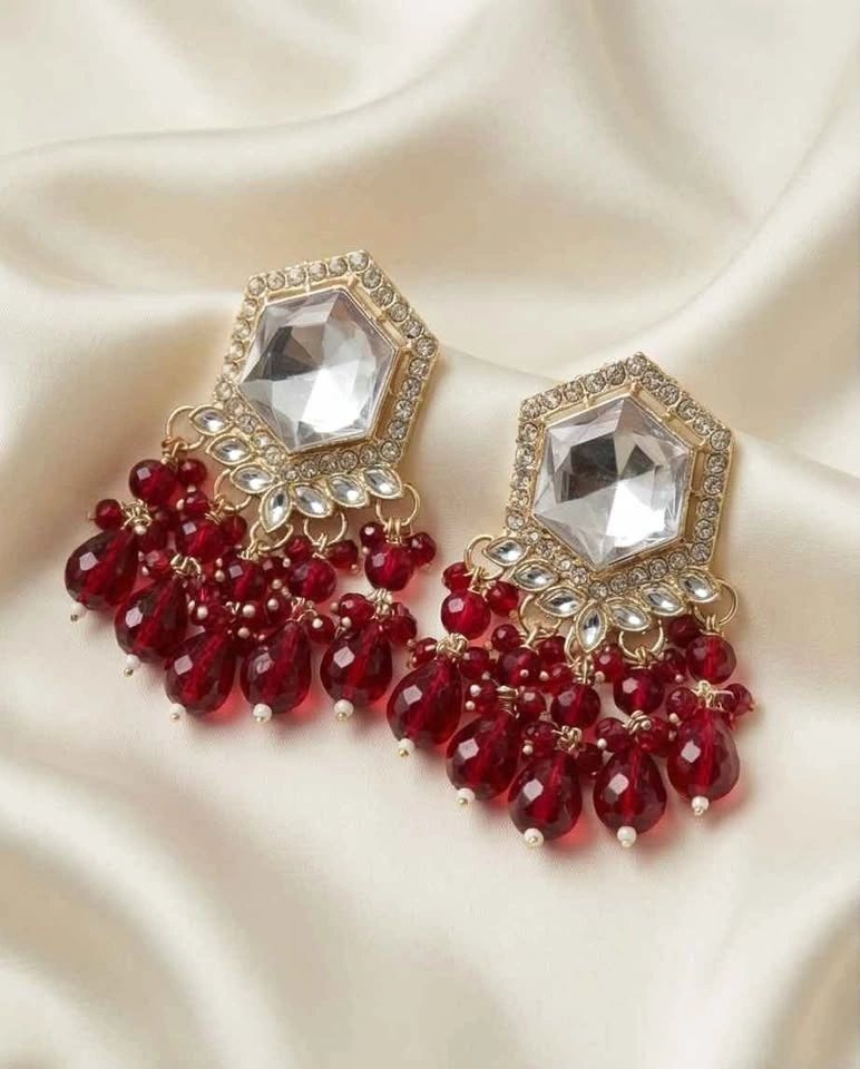 Sparkly earrings! Has a gold tone setting with a big clear stone. Lots of beads drop down, some with tiny white accents. Super pretty.