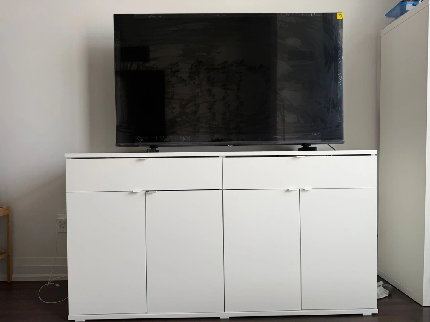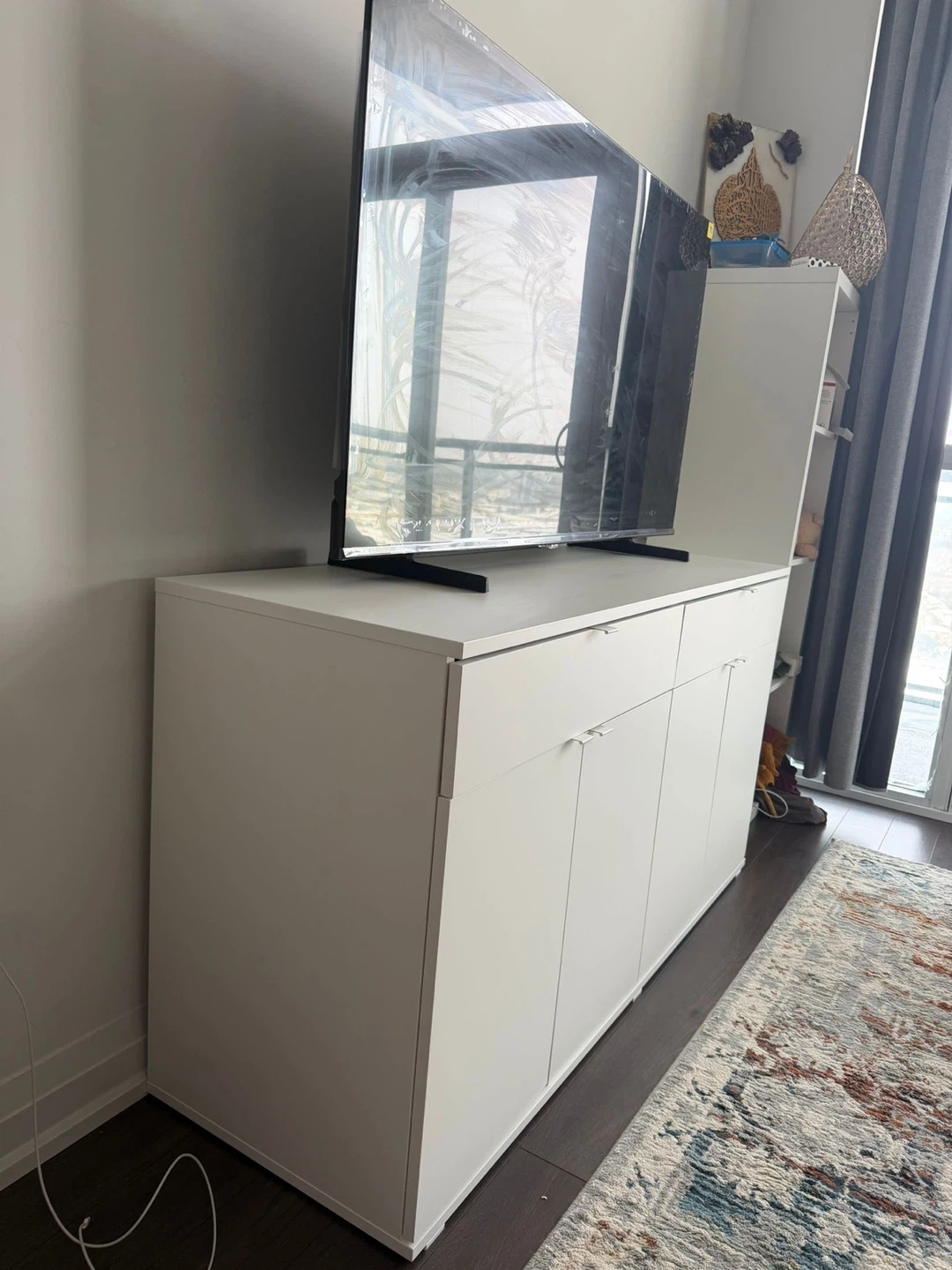 This white storage cabinet features two drawers on top and four doors below. It provides ample space for organizing various items. The clean, modern design complements many home decors. Use it to store media equipment, books, or household essentials.