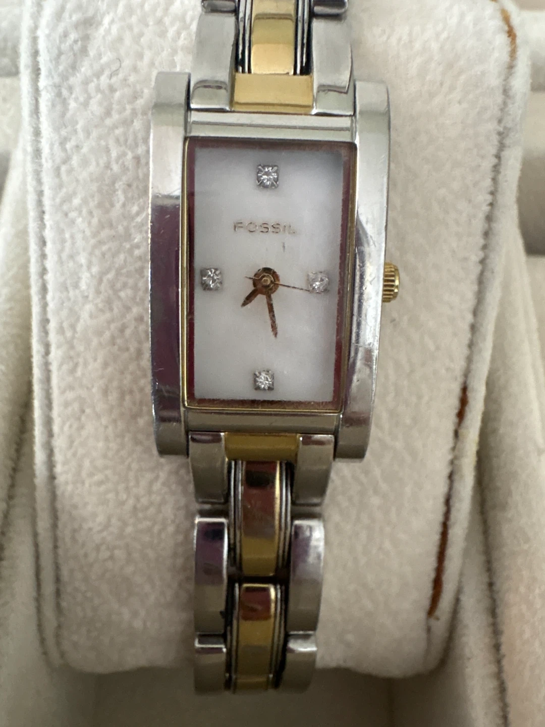 This is a Fossil watch with a two-tone silver and gold band. It has a rectangular white face with diamond markers. The watch is functional and ready for a new owner!