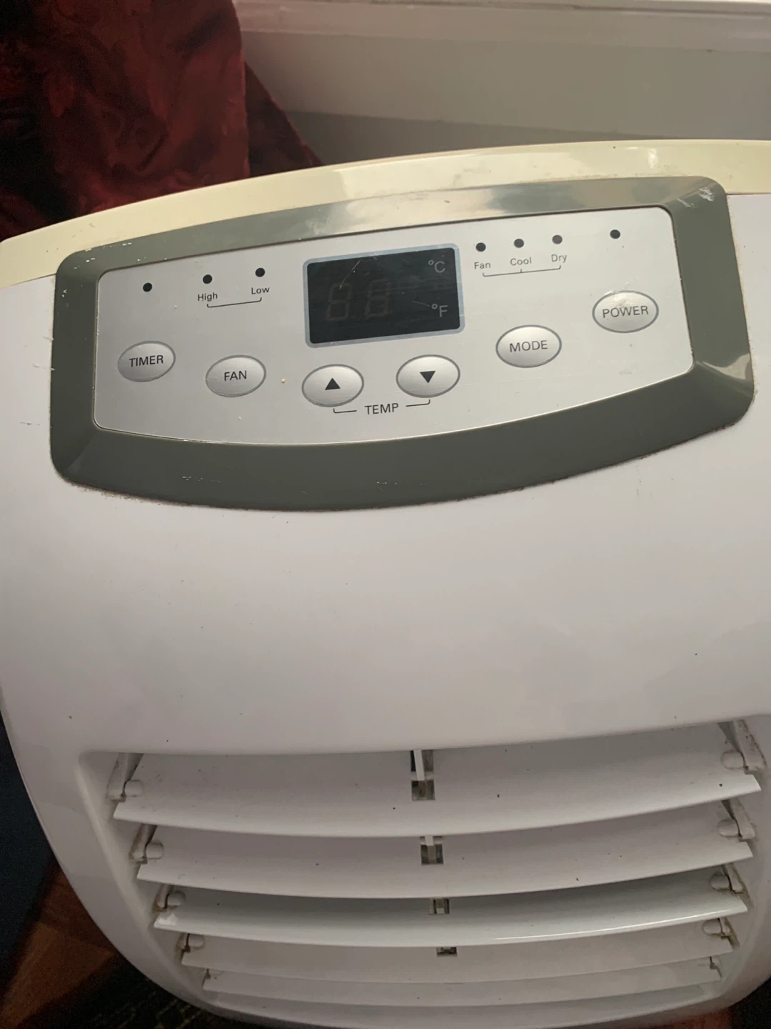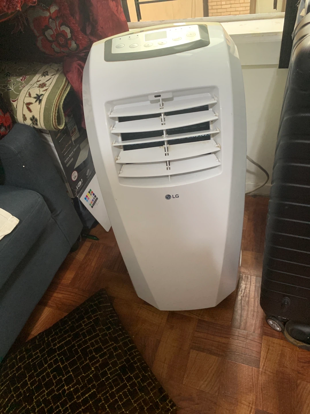 This is an LG portable air conditioner. It has multiple settings including timer, fan speed, and mode options. Perfect for cooling a room!