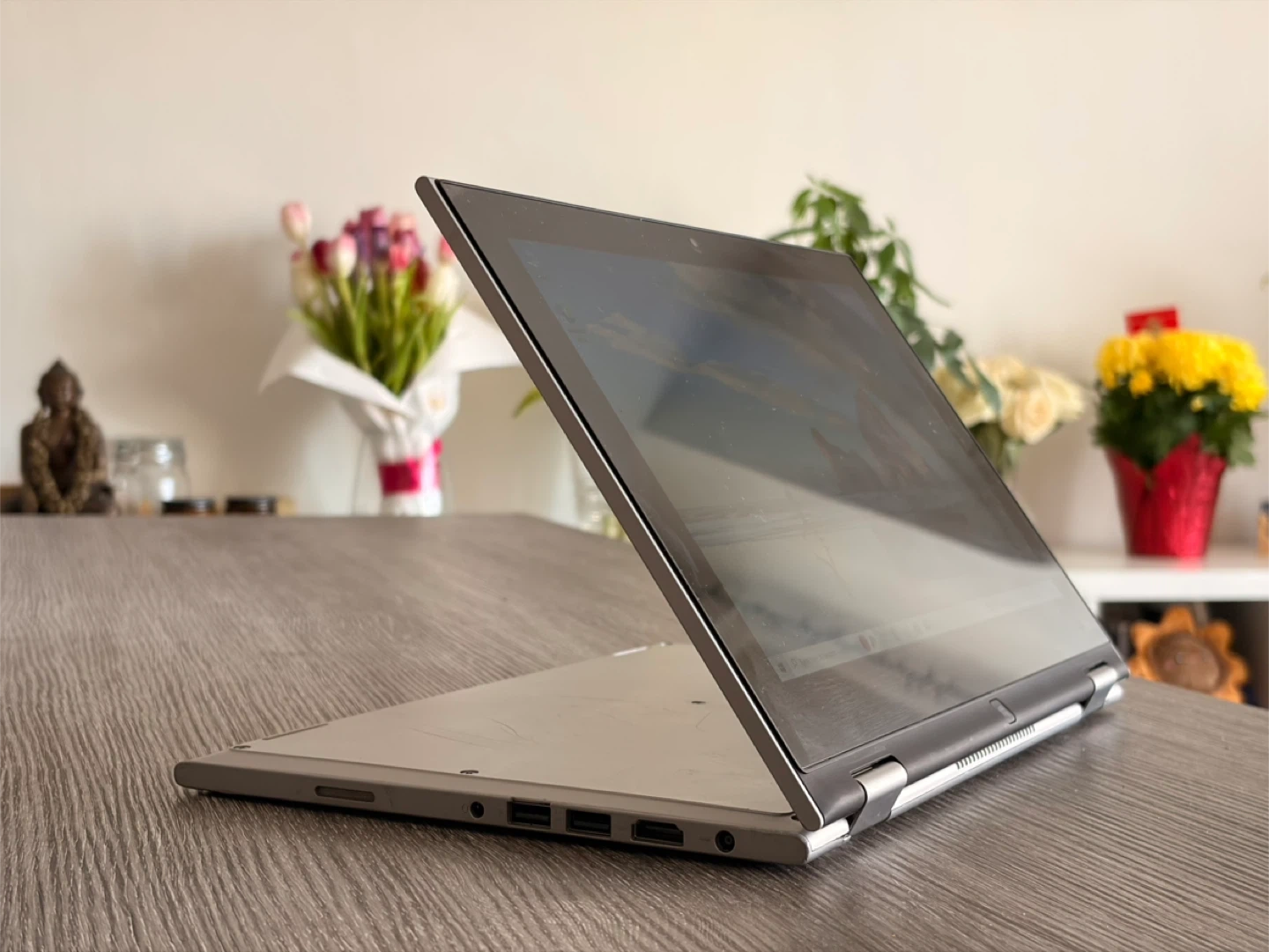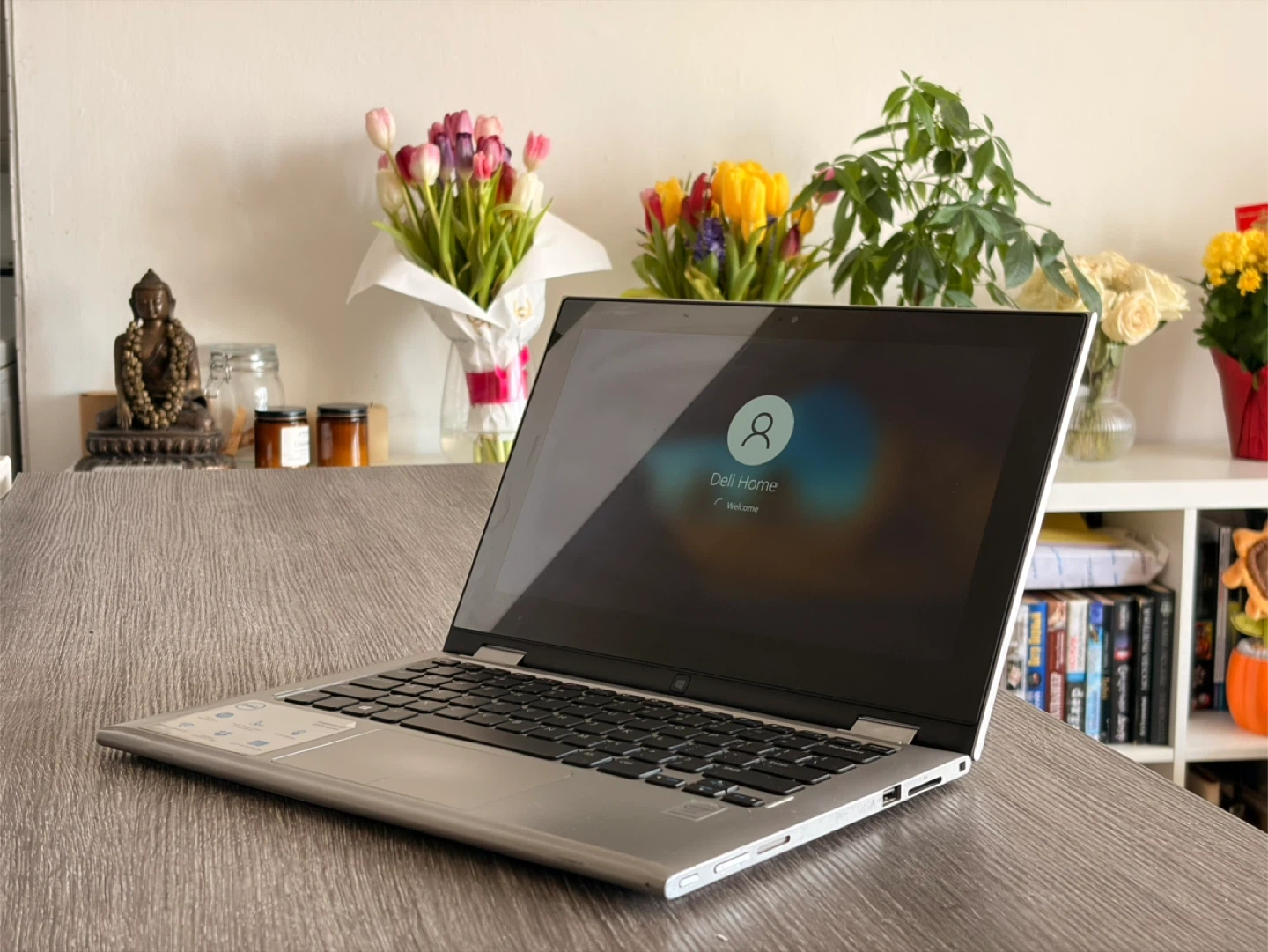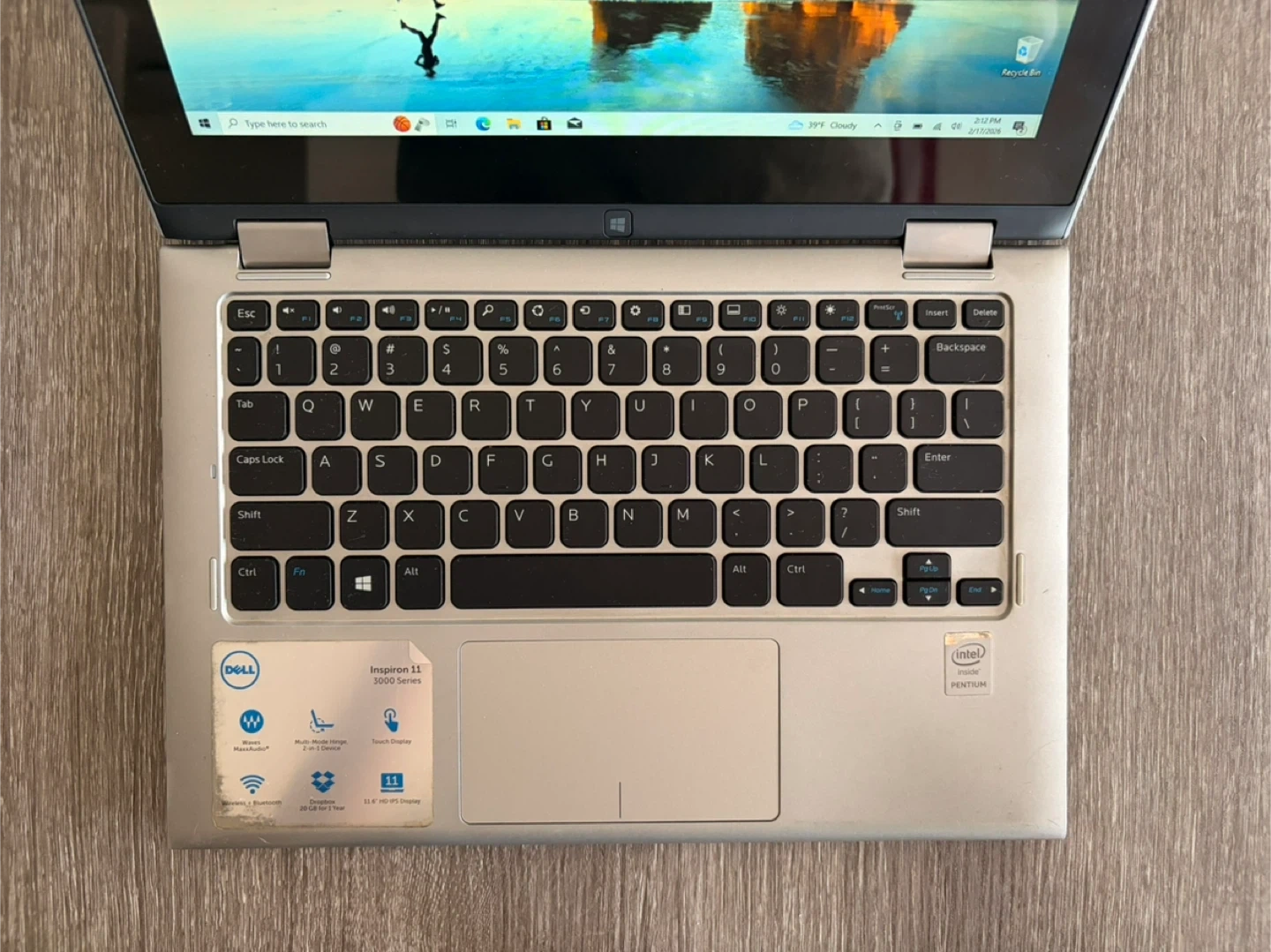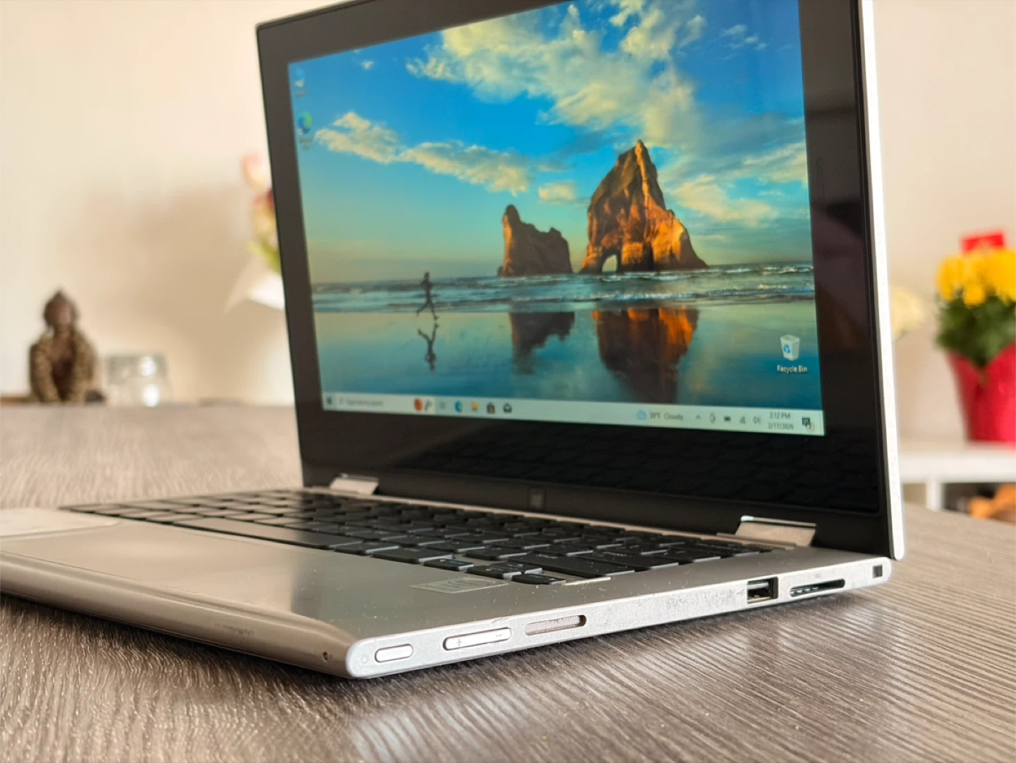 This is a Dell Inspiron 3000 Series 2-in-1 convertible laptop. It features a touch-screen display and runs on Windows. It's a versatile device that can be used as a traditional laptop or a tablet.