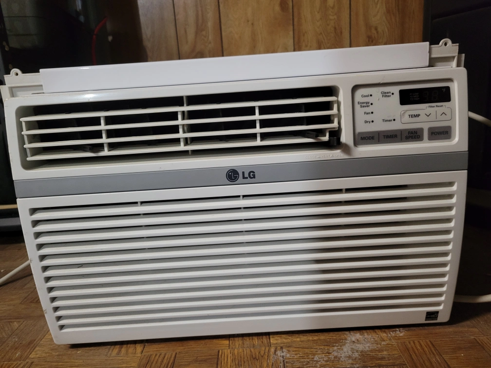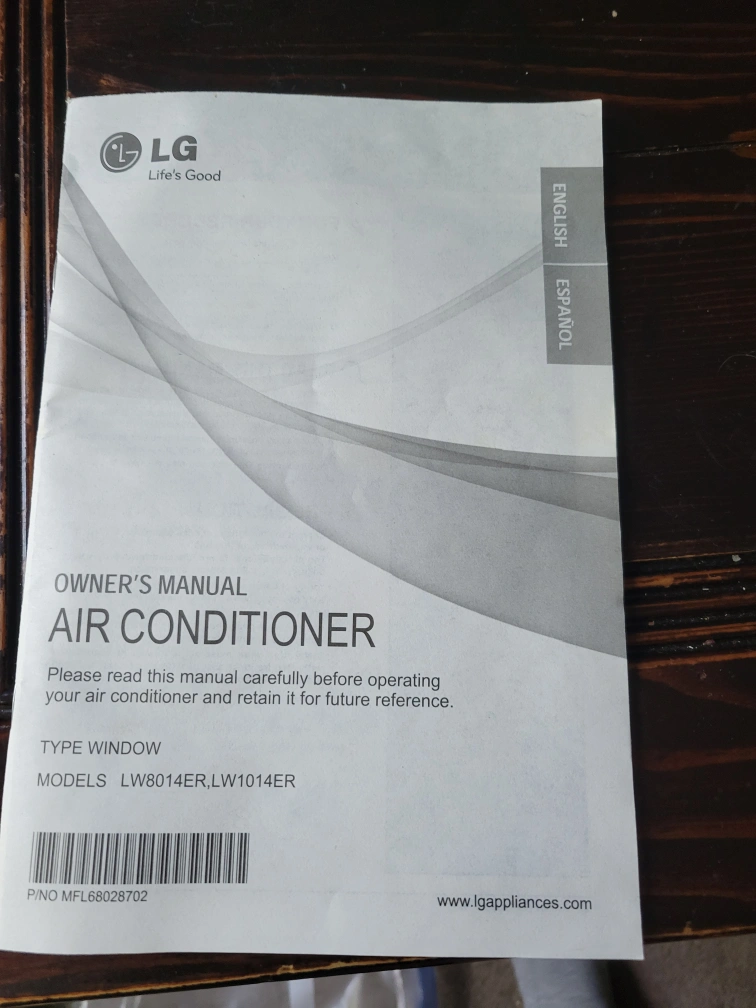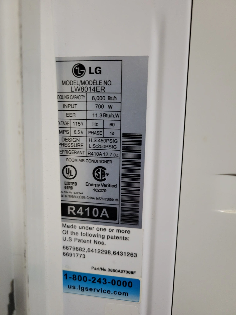 Selling an LG window air conditioner, model LW8014ER. It has a cooling capacity of 8,000 BTU/h and comes with a remote control and owner's manual. cash only