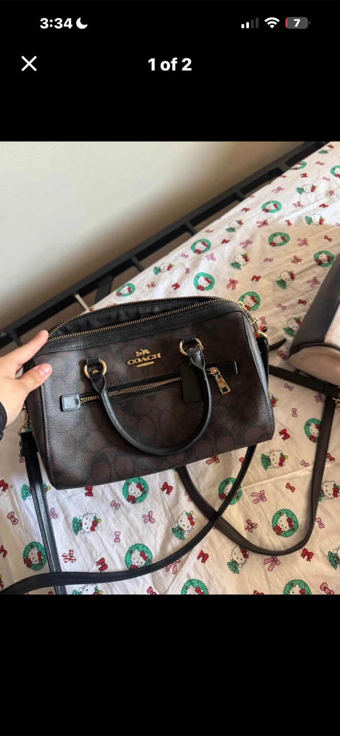 This is a Coach satchel bag with the signature pattern. It's dark brown with gold-tone hardware. The bag has top handles and a detachable crossbody strap. It has multiple zipper compartments for organization.