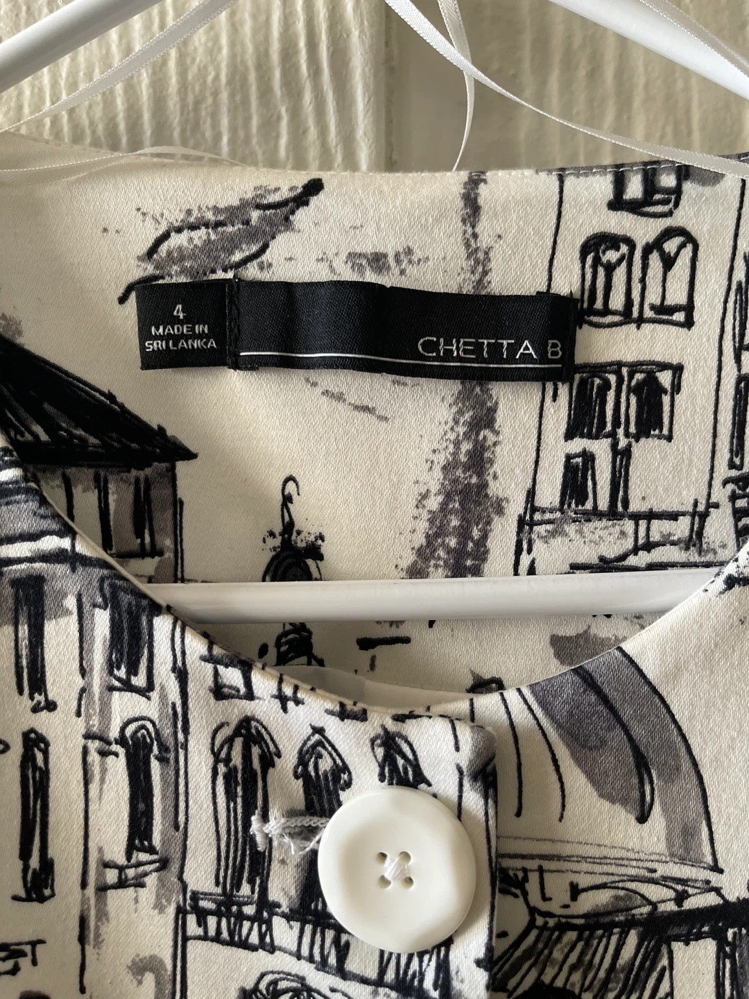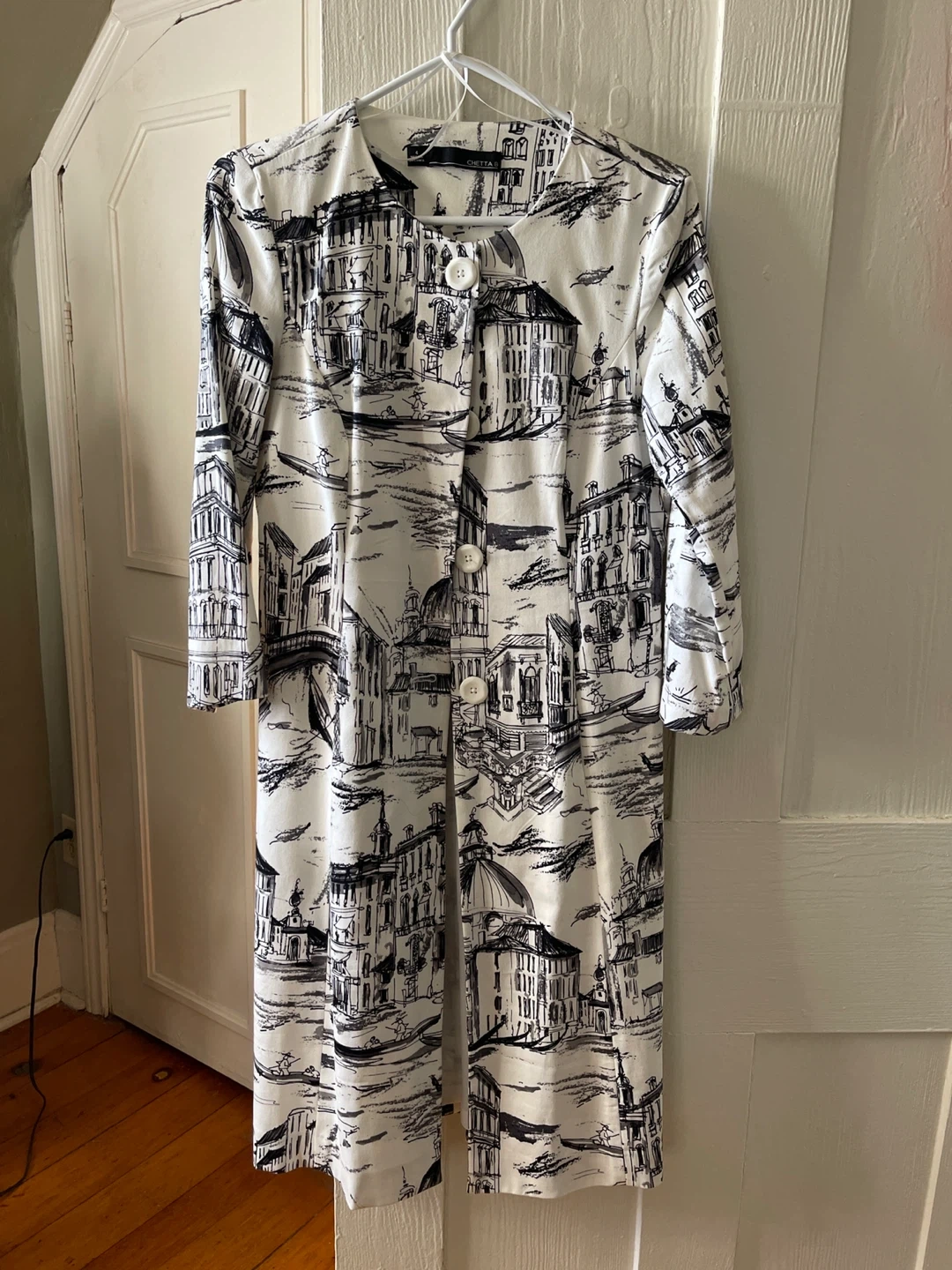 Selling a Chetta B coat in size 4. The coat has a unique black and white cityscape design. The material is 97% cotton and 3% spandex.