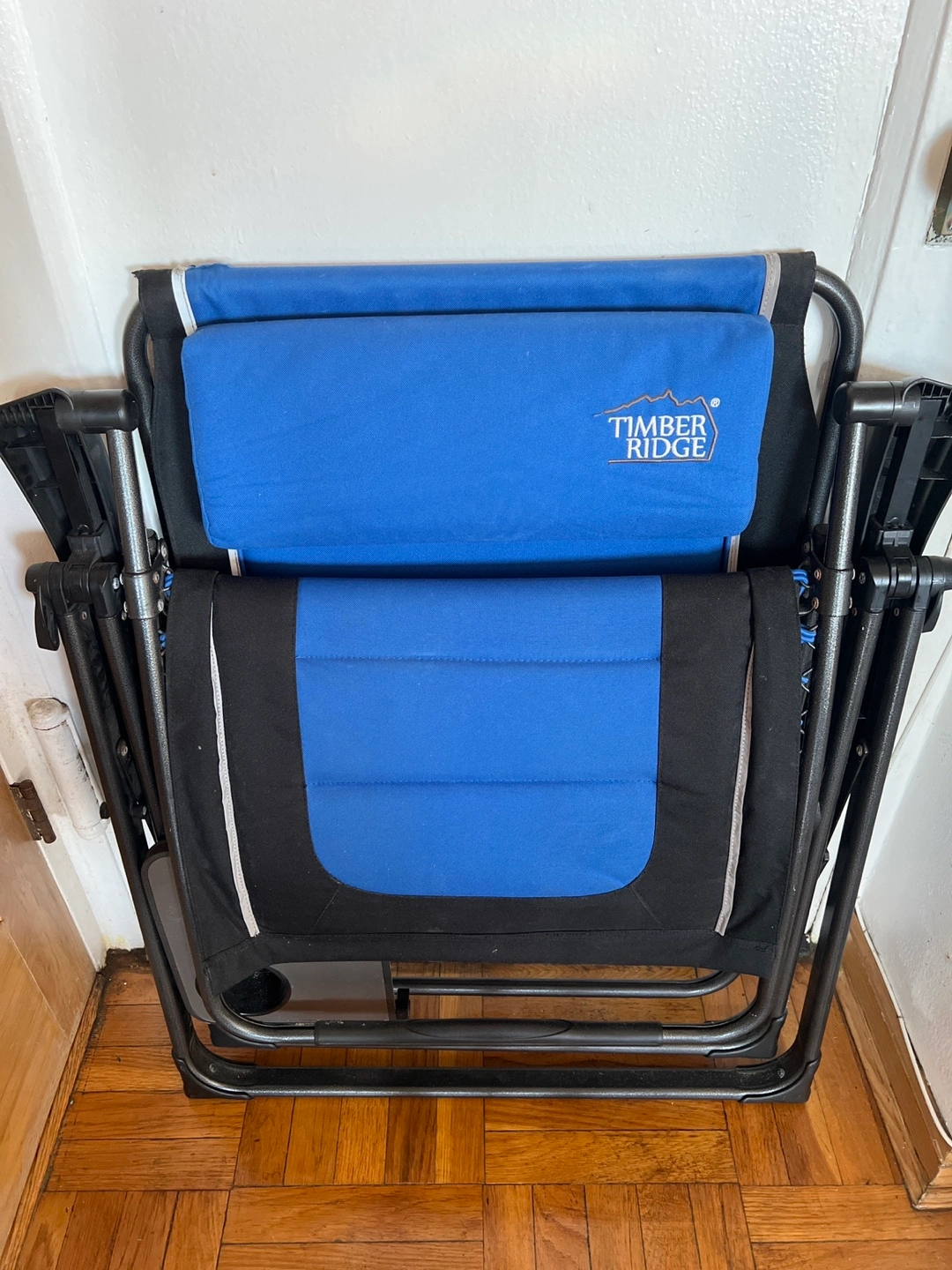 Blue and black folding zero gravity chair. Reclines to multiple positions. Includes a headrest, and cup holder attachment. Great for Beach, patio, and/or backyard.