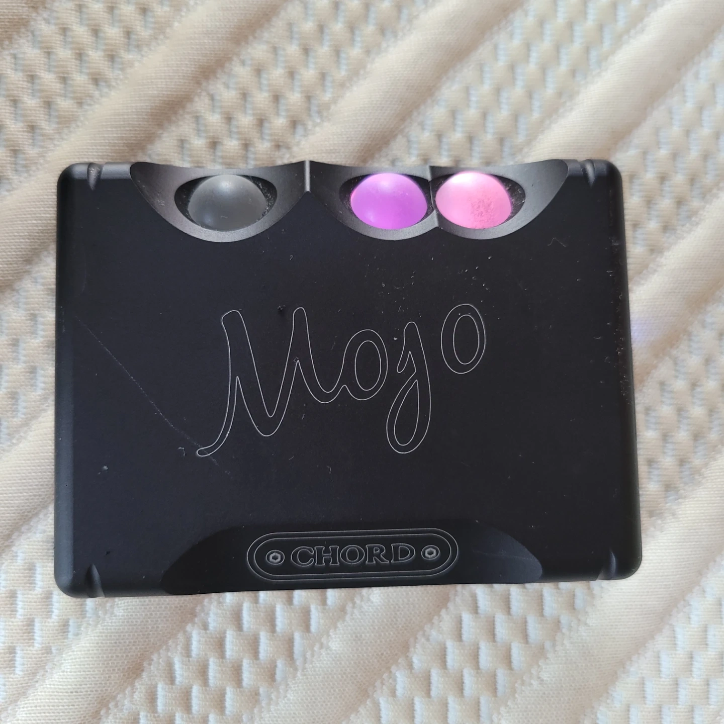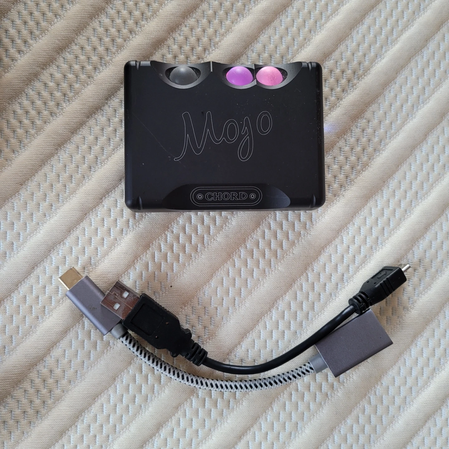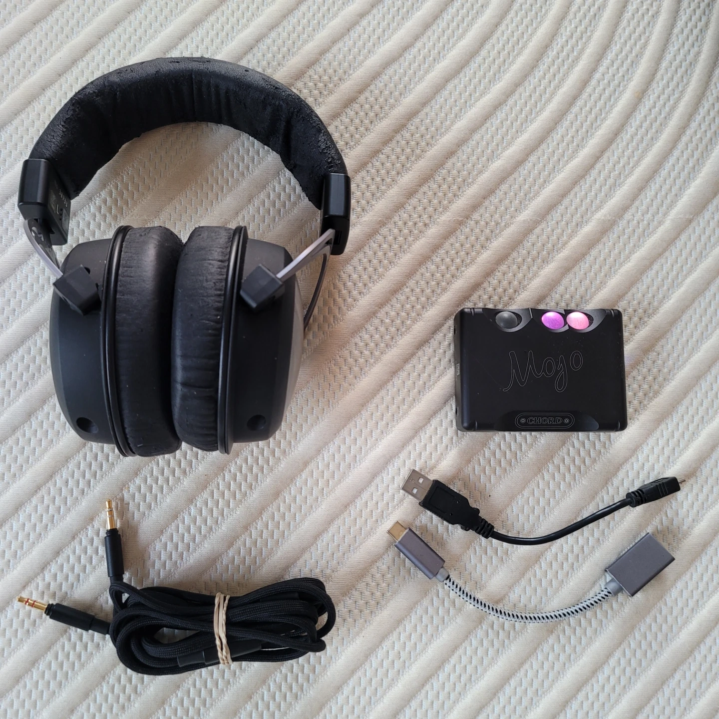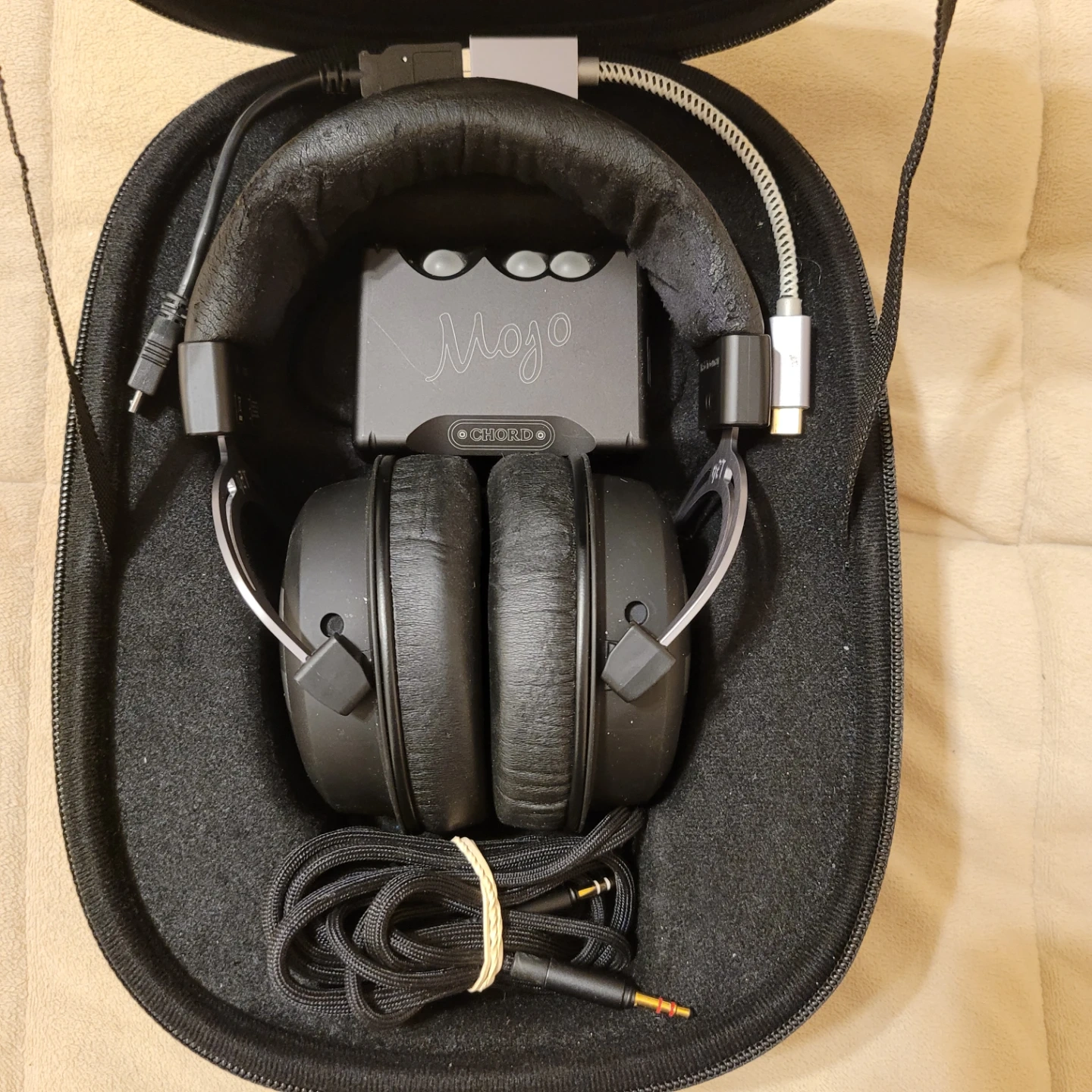 High-quality over-ear headphones and a portable DAC. The headphones are black with a silver accent. The Chord Mojo is a compact digital-to-analog converter. Includes all necessary cables and original case. Great audio setup for on-the-go listening!