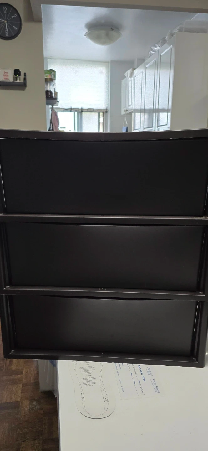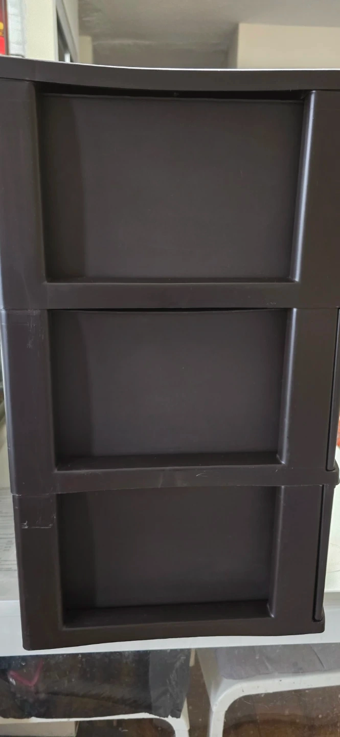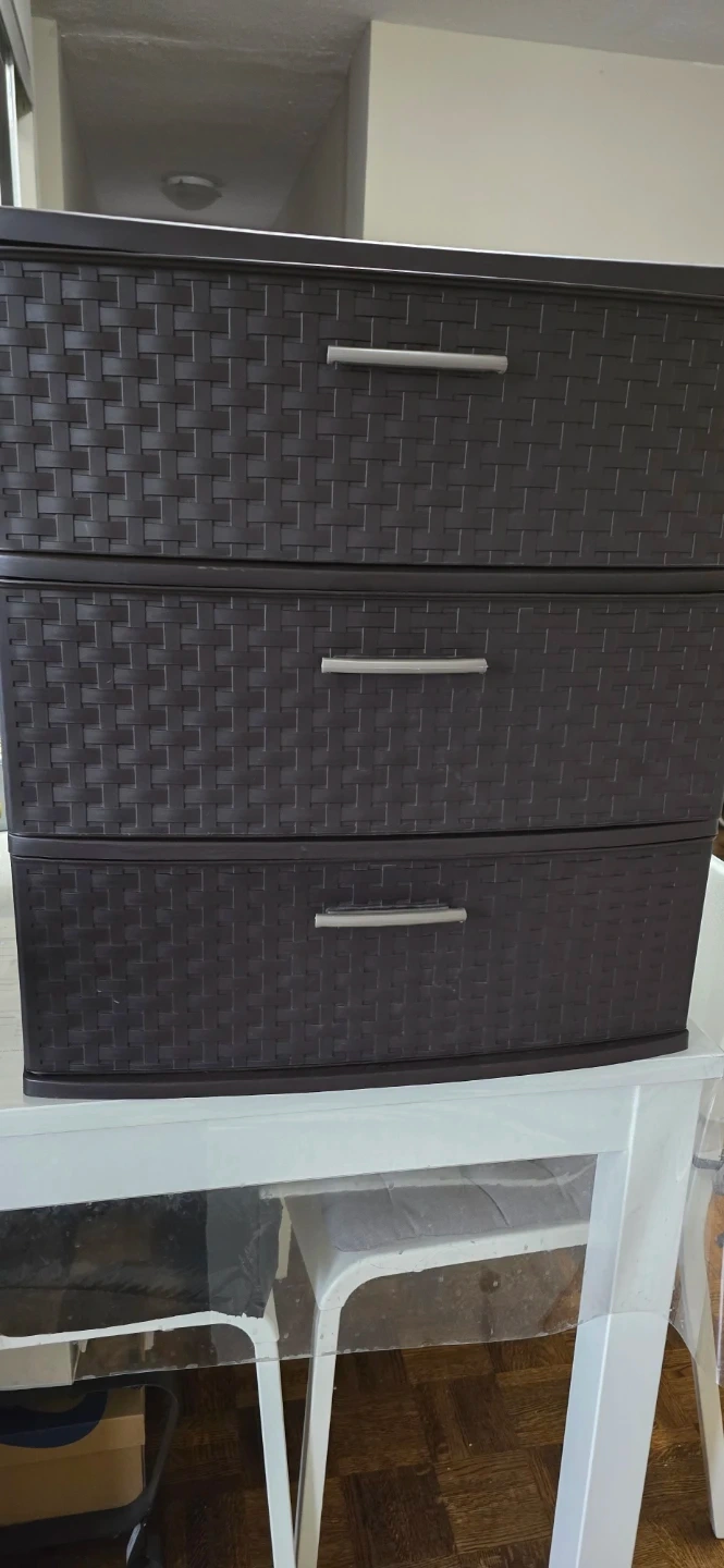 This Sterilite rolling storage cart comes with three drawers for organization. It's made of dark brown plastic and features silver handles. The cart has wheels for easy movement. Can go as a pair for double the listed price, or in singles for the listed price.