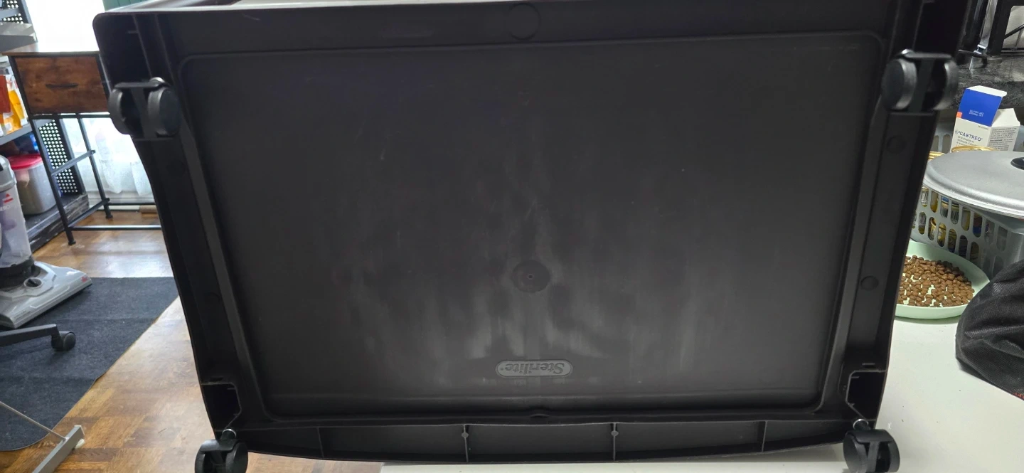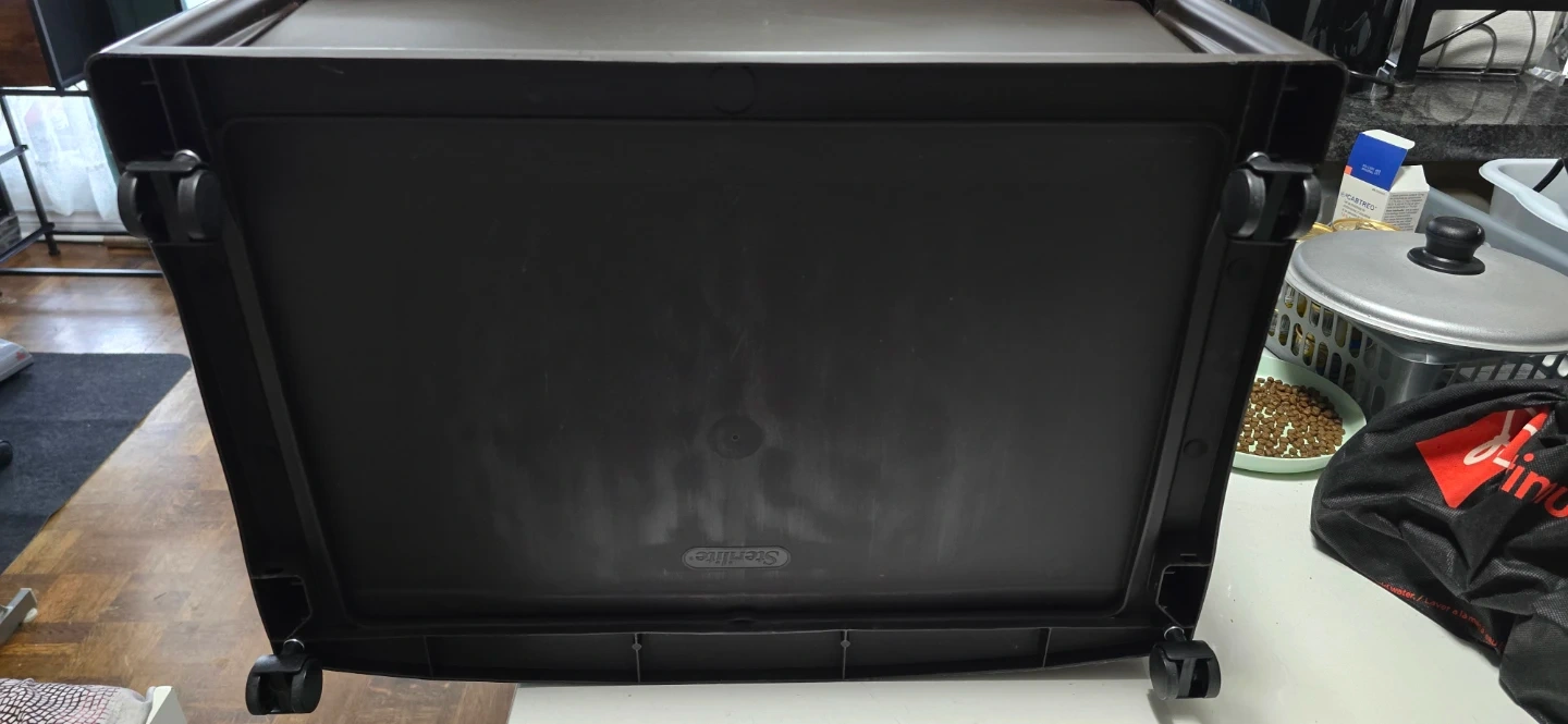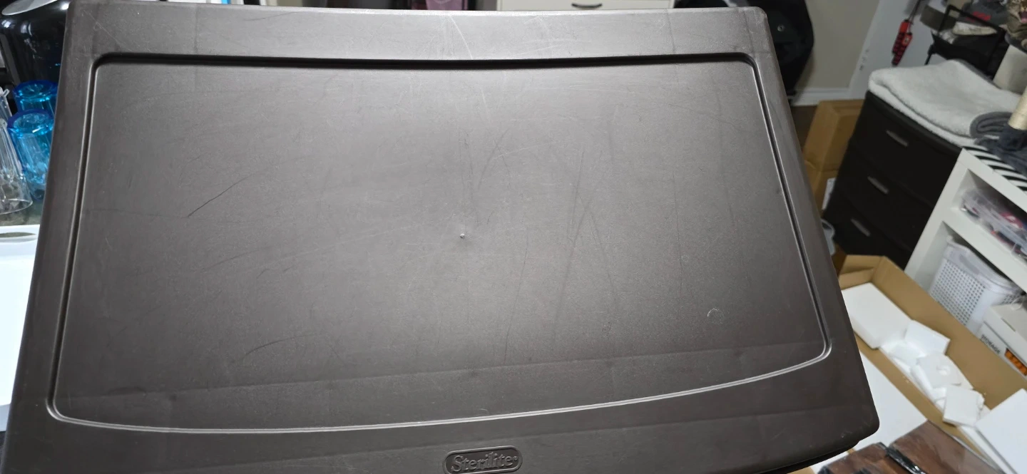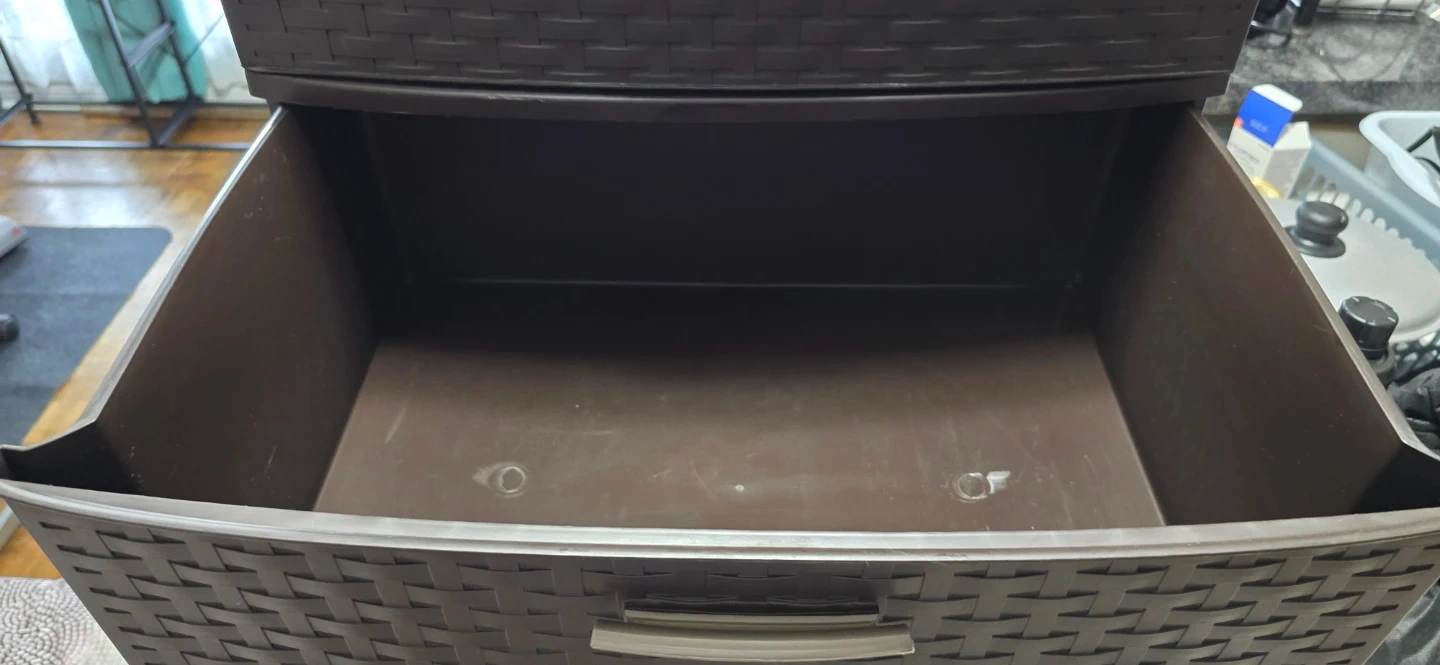 This Sterilite rolling storage cart comes with three drawers for organization. It's made of dark brown plastic and features silver handles. The cart has wheels for easy movement. Can go as a pair for double the listed price, or in singles for the listed price.
