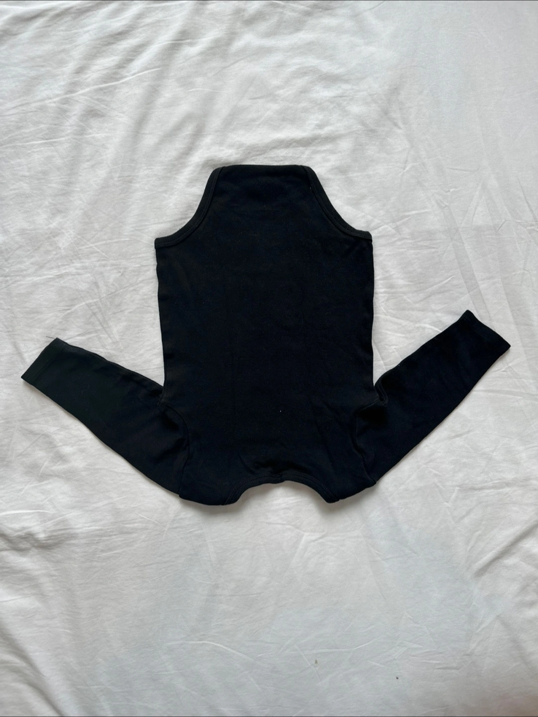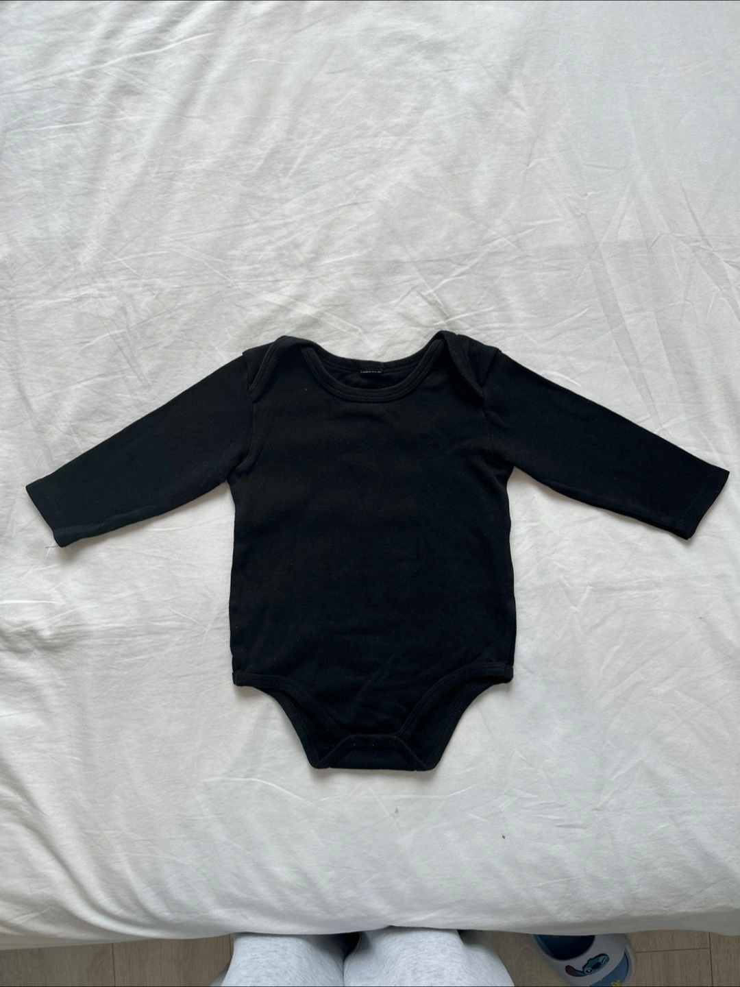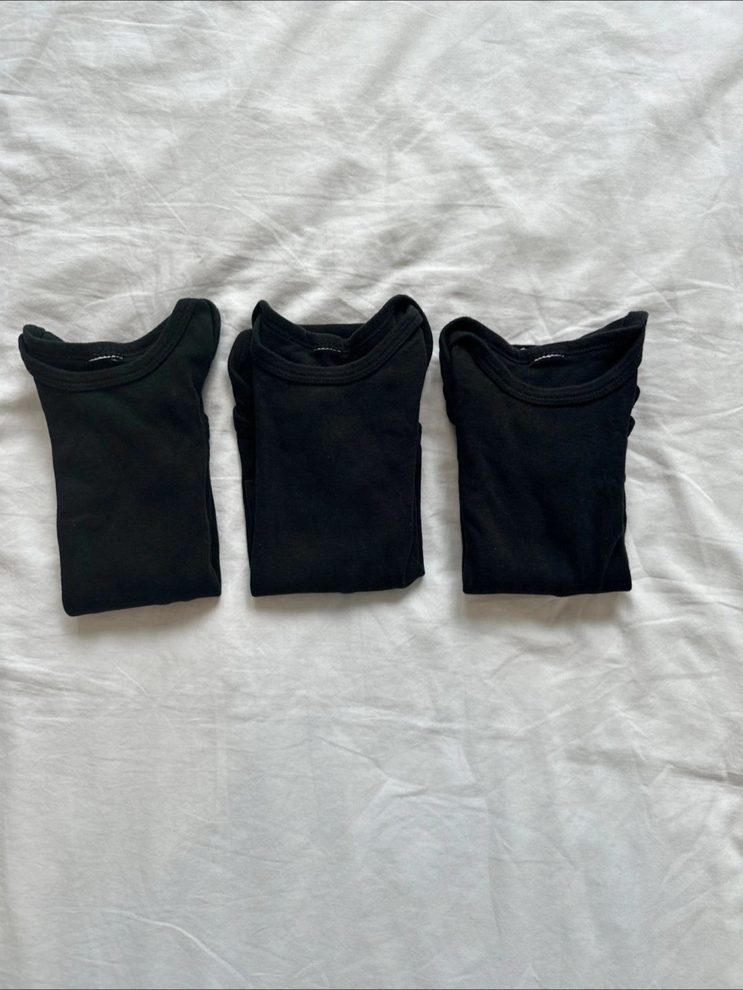 These are three black long-sleeved bodysuits for babies. They're made of a soft, stretchy cotton blend. Easy snaps at the bottom for quick changes. Perfect for everyday wear!