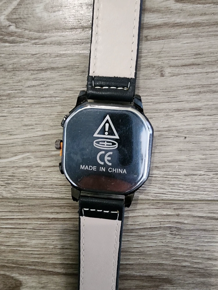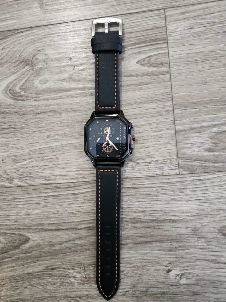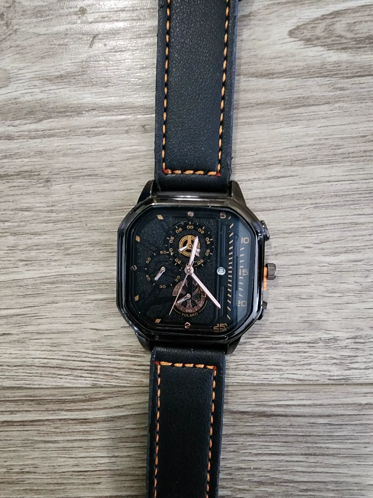 Selling a Yolako watch with a stylish black leather strap! The watch has a unique square face and a detailed dial. The strap is stitched with orange thread, adding a nice touch. It's in great condition and ready for a new wrist