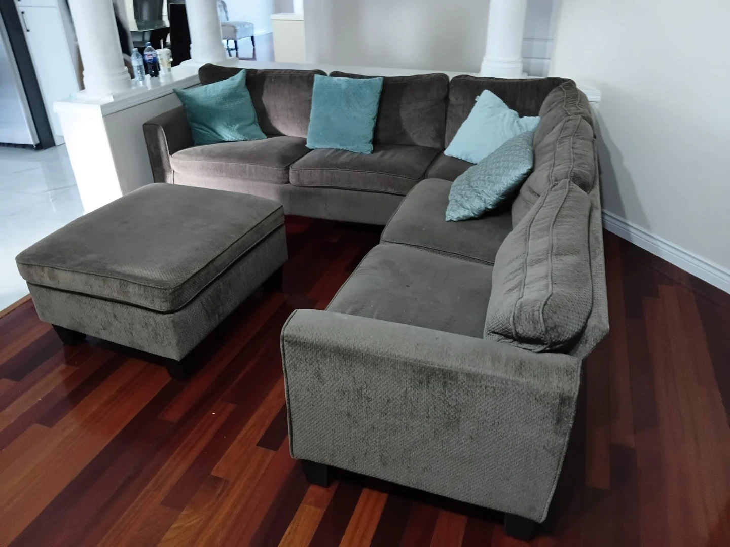 This is a comfortable brown sectional sofa, perfect for lounging. It comes with an ottoman for extra seating or a footrest. The fabric is durable and neutral. It's a great addition to any living room!