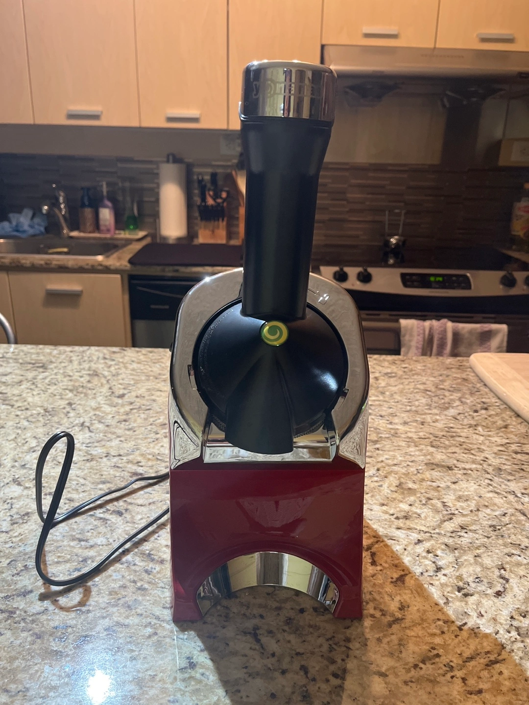 Yonanas frozen fruit-ice cream maker. Red plastic housing, chrome accents. Power cord included. Used only once, in excellent condition.