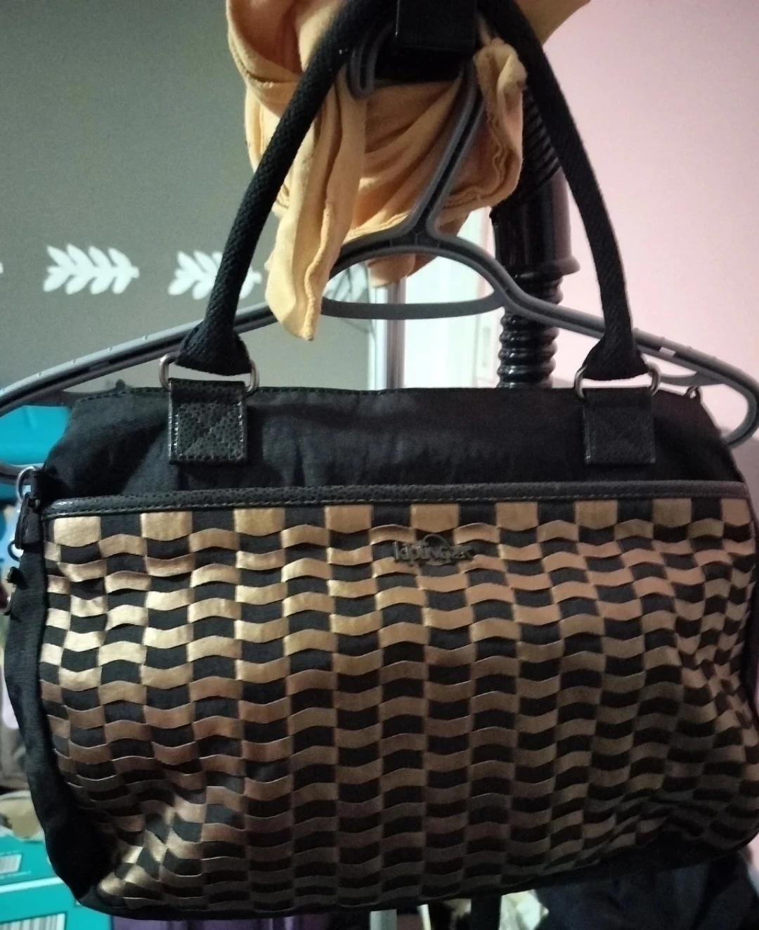 This Kipling shoulder bag has a black base with a distinctive gold wave pattern. It features comfortable black rope handles and durable black leather accents. It's a stylish and practical accessory for everyday use.