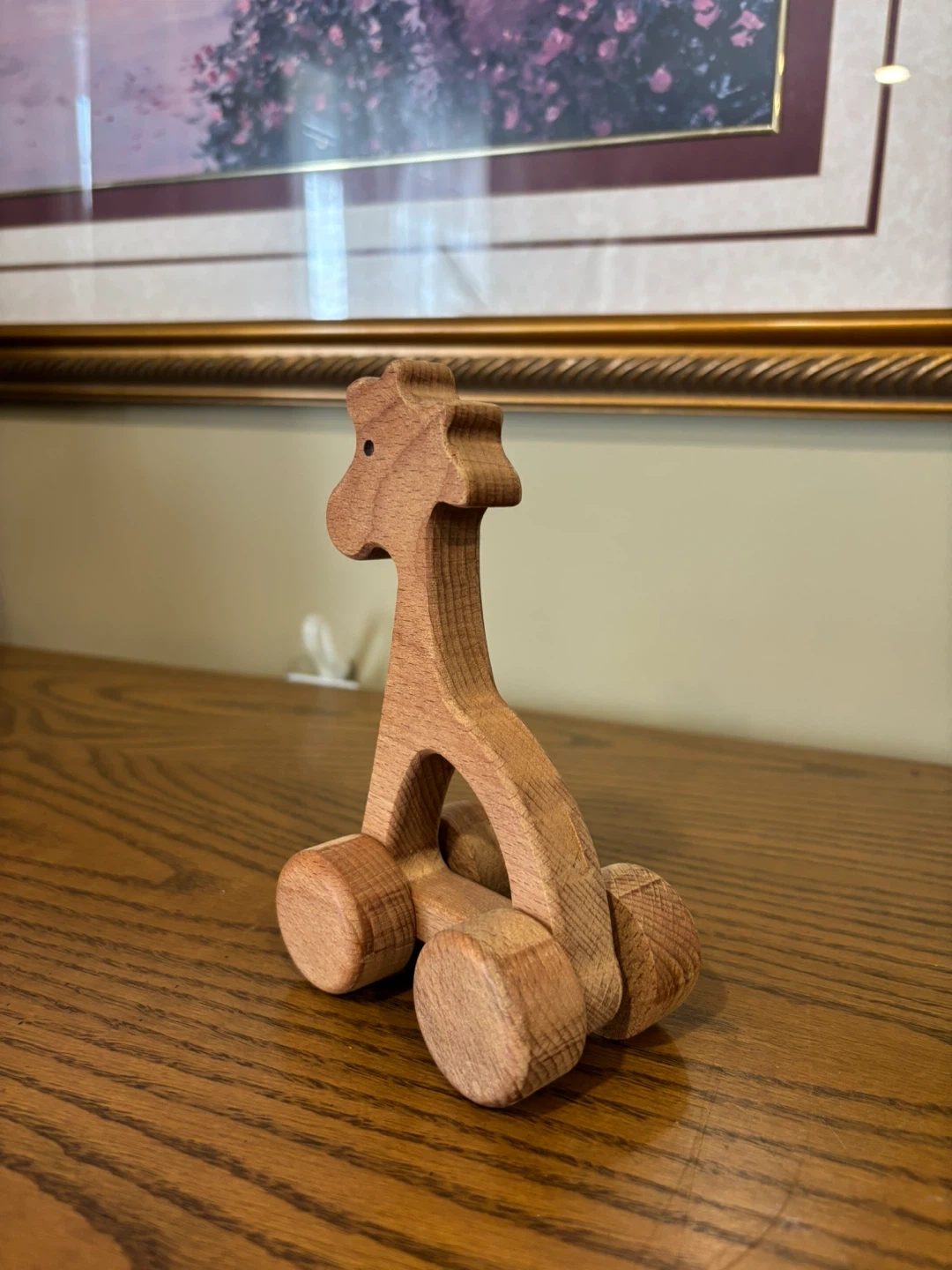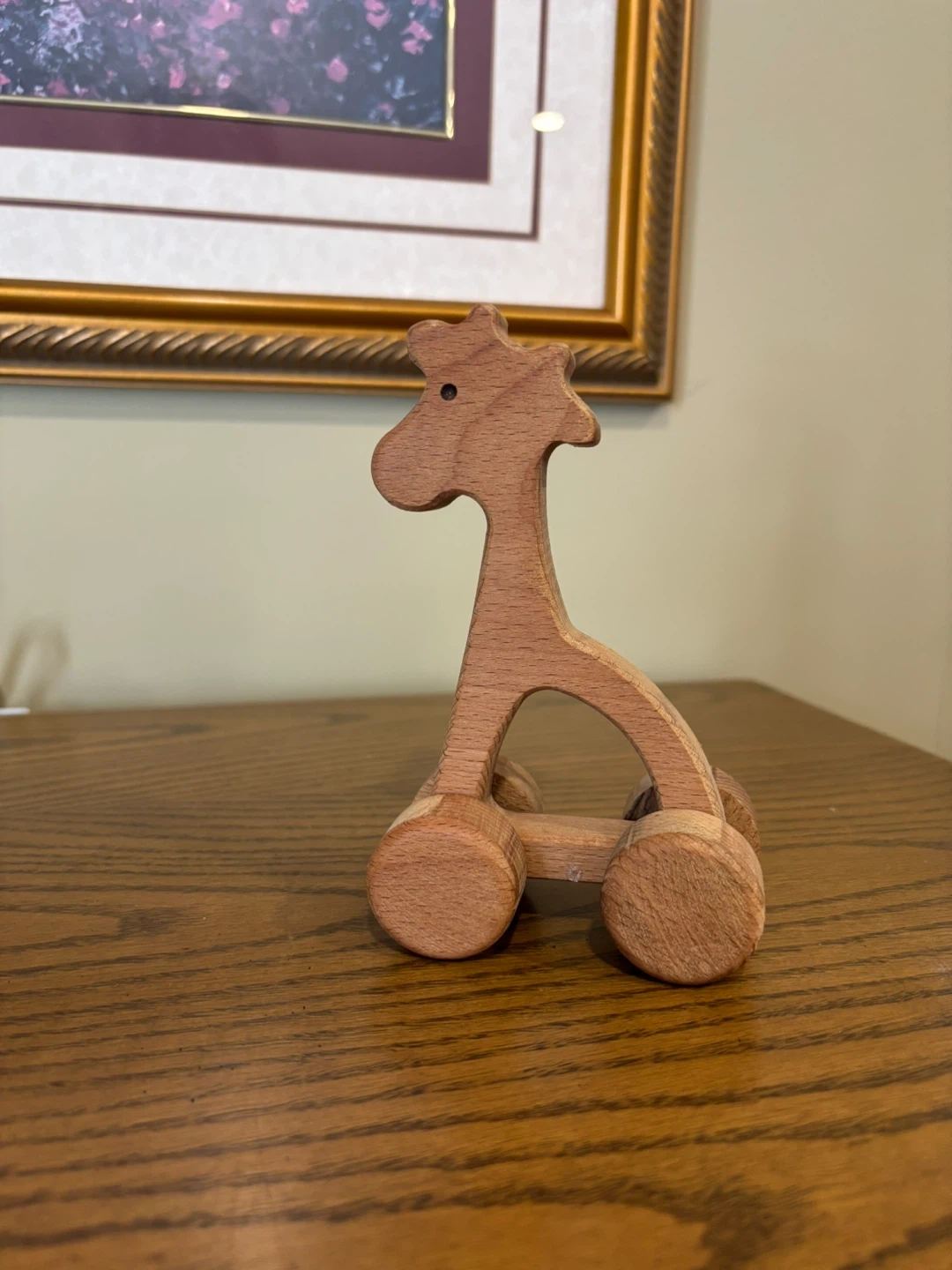 Cute wooden giraffe toy on wheels, made from solid natural wood. Smooth finish with rounded edges, perfect for little hands.