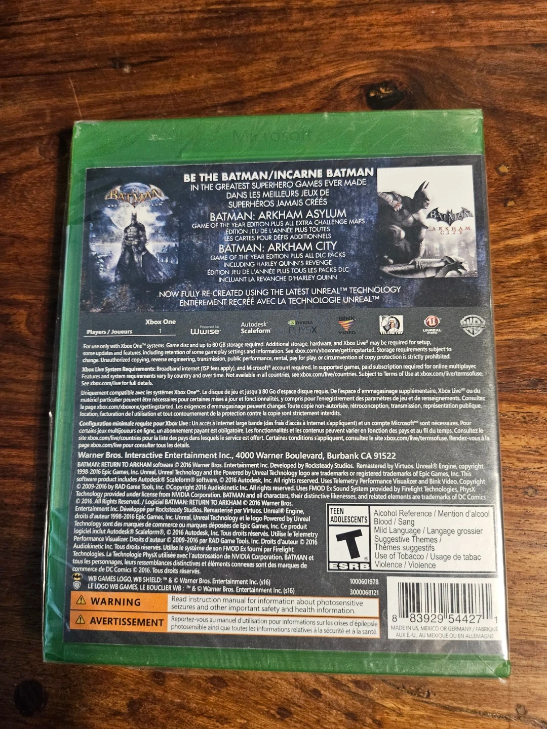 Batman: Return to Arkham includes Batman: Arkham Asylum and Batman: Arkham City. Both remastered games feature updated graphics and modernizations. This is the Xbox One version of the collection.