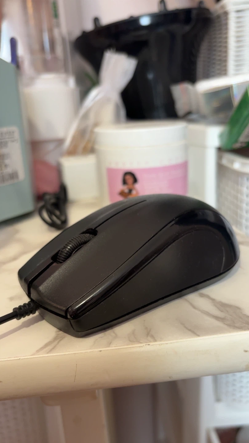 A simple wired computer mouse in black. It features a scroll wheel and a classic design. This mouse is compatible with most computers. It's perfect for everyday tasks!
