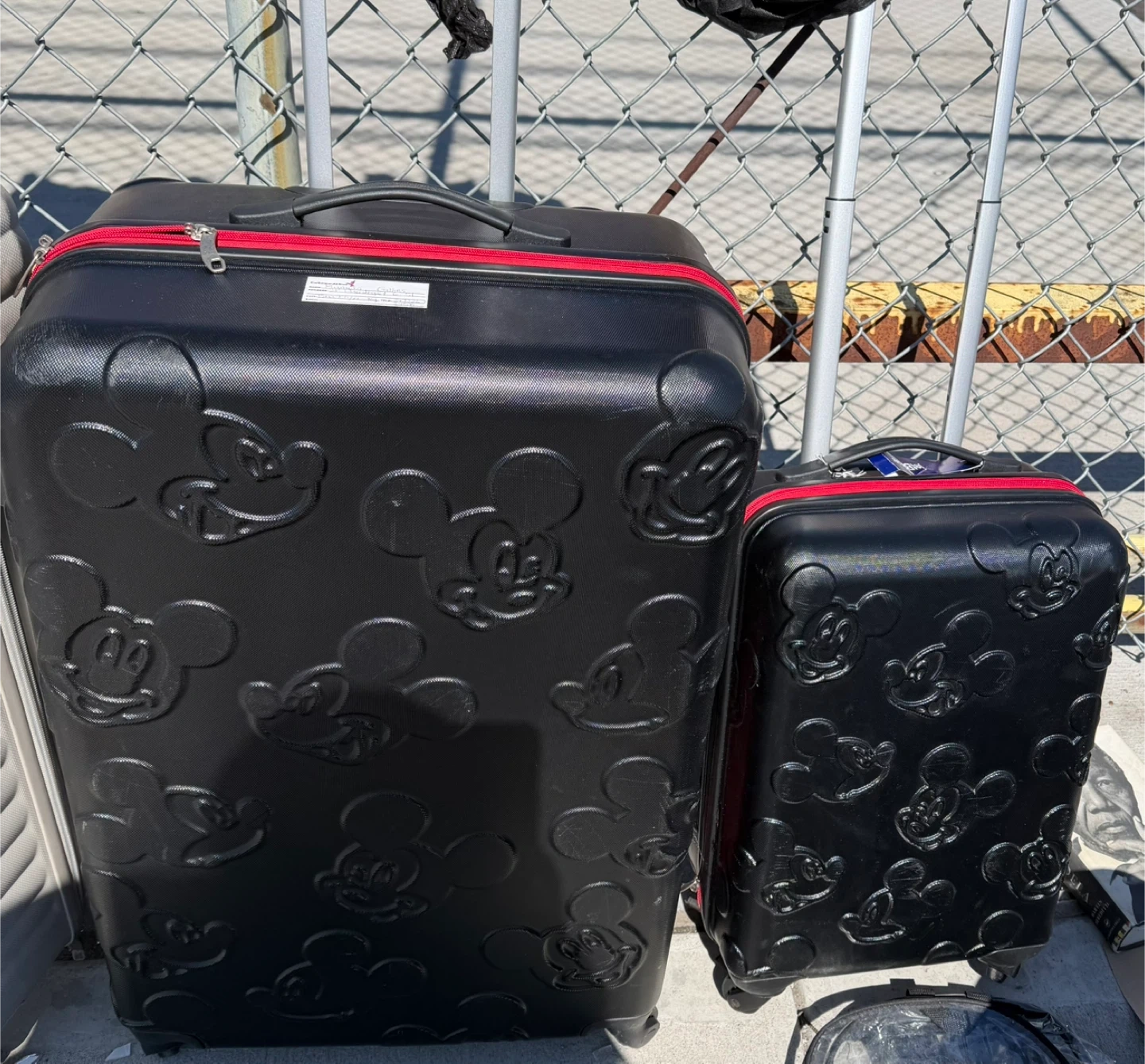 Two black suitcases featuring embossed Mickey Mouse designs. Includes a larger checked bag and a smaller carry-on size. Both have red zipper accents and silver telescoping handles. Great for Disney trips!
