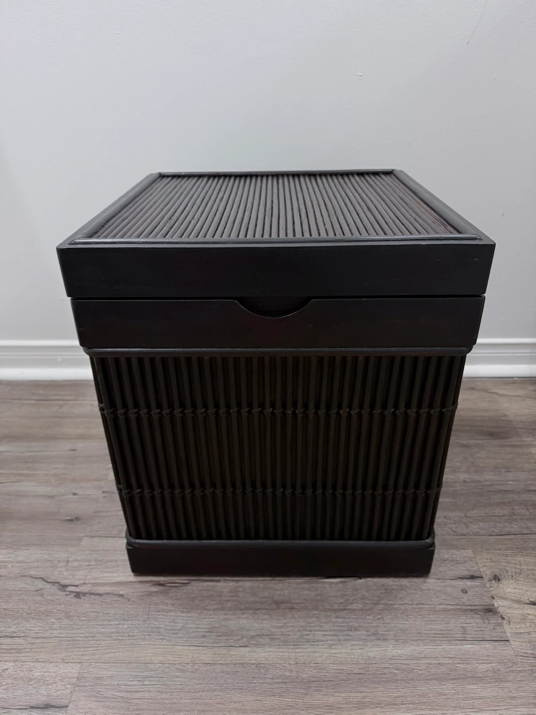 ✨A dark brown storage box with a woven/rattan detail. ✨It's perfect for keeping your space tidy.