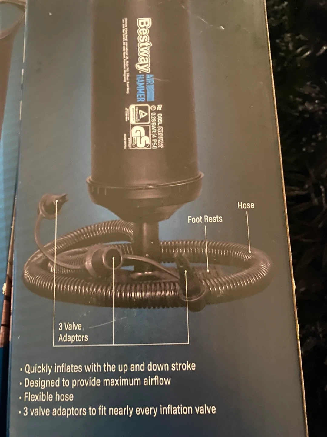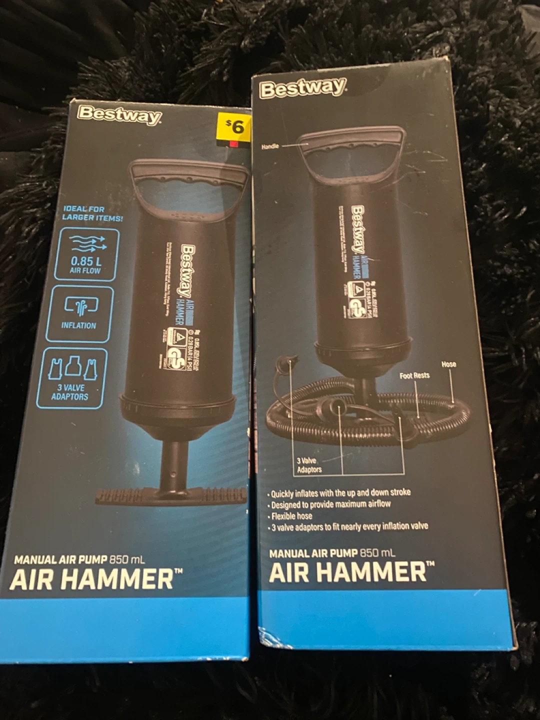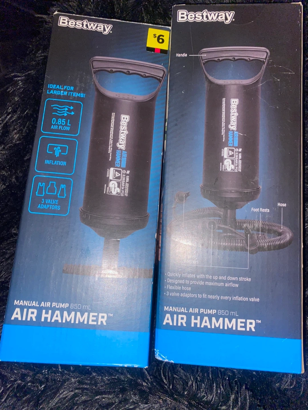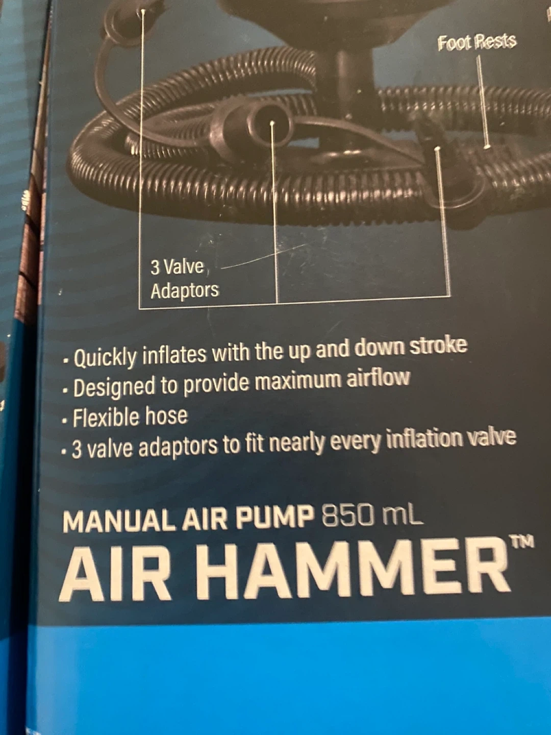 This Bestway Air Hammer manual air pump has a large 850 mL capacity. It includes 3 valve adaptors to fit nearly every inflation valve. It inflates with an up and down stroke and has a flexible hose for ease of use.