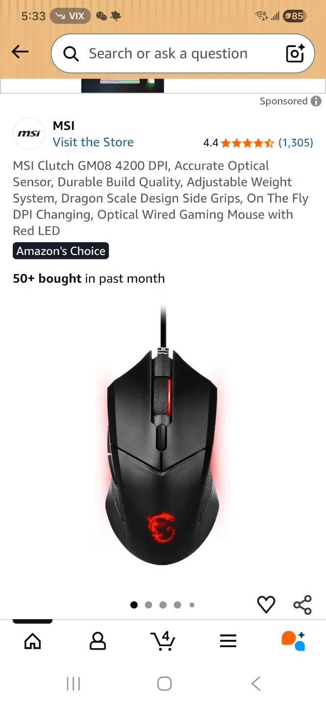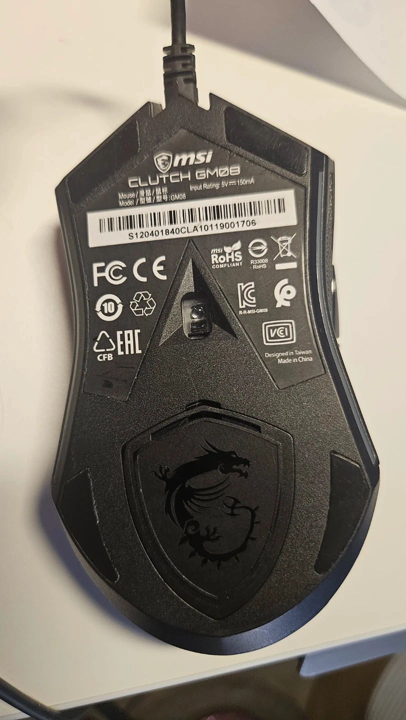 MSI Clutch GM08 gaming mouse with 4200 DPI optical sensor. It has adjustable weight and RGB lighting. Designed for comfort and performance during gaming sessions.