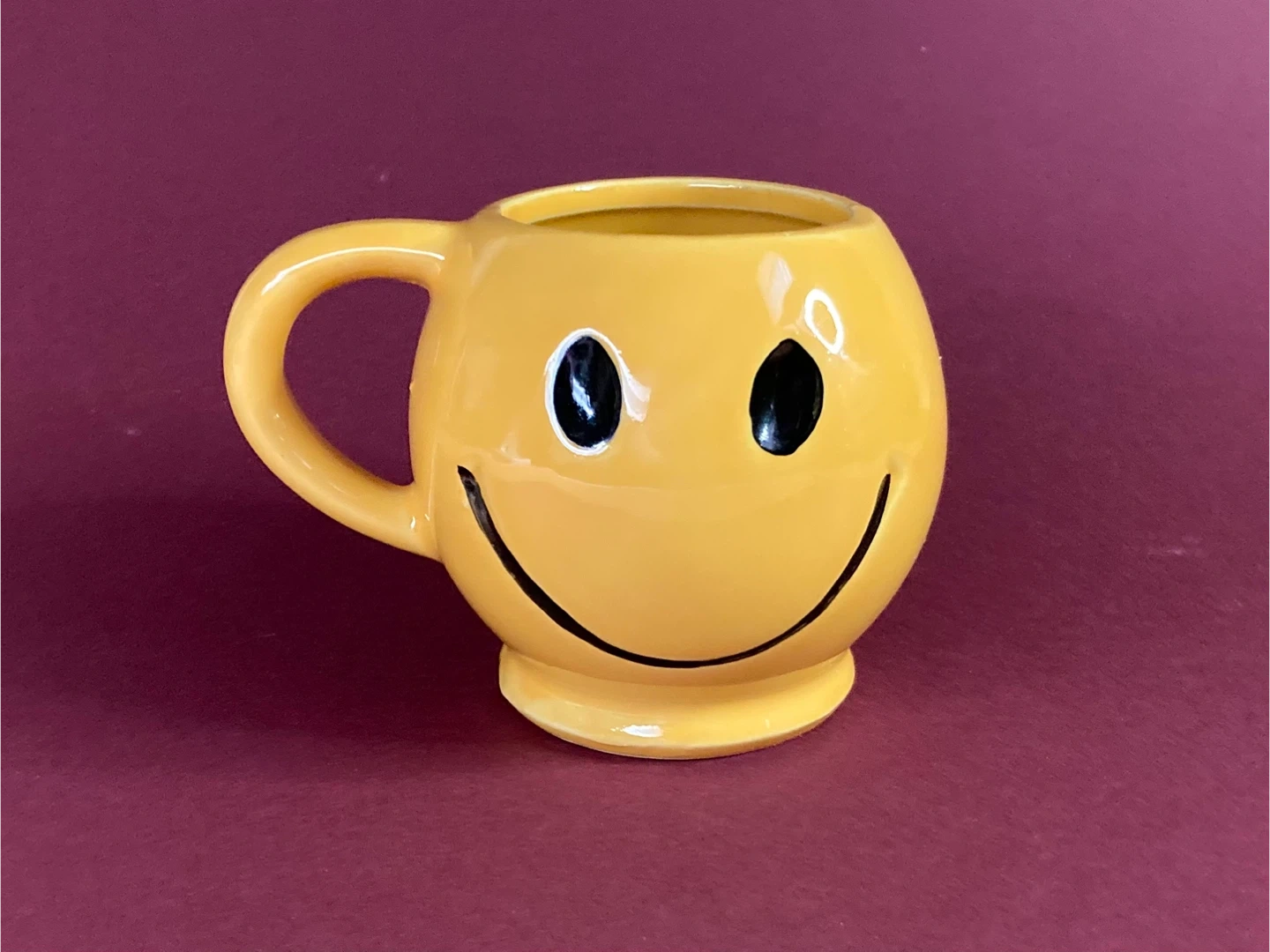 Vintage iconic McCoy pottery smiley face mug from the 1970s. Made in USA. About 5 inches wide and 4 inches tall. Excellent vintage condition.