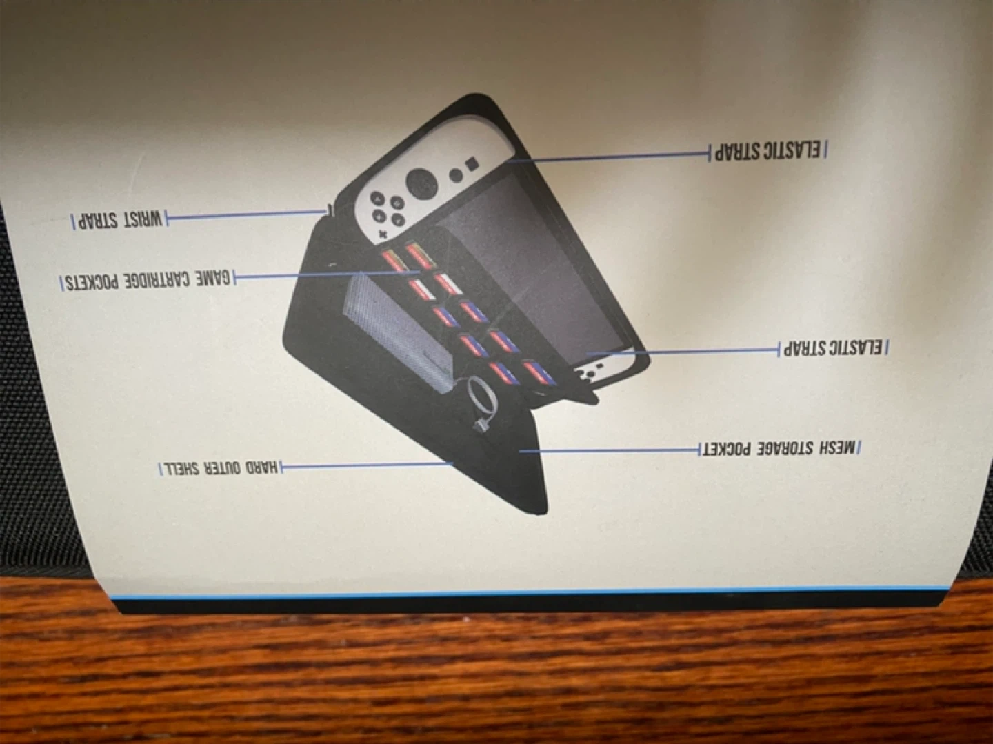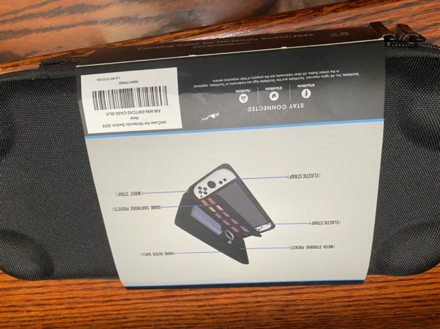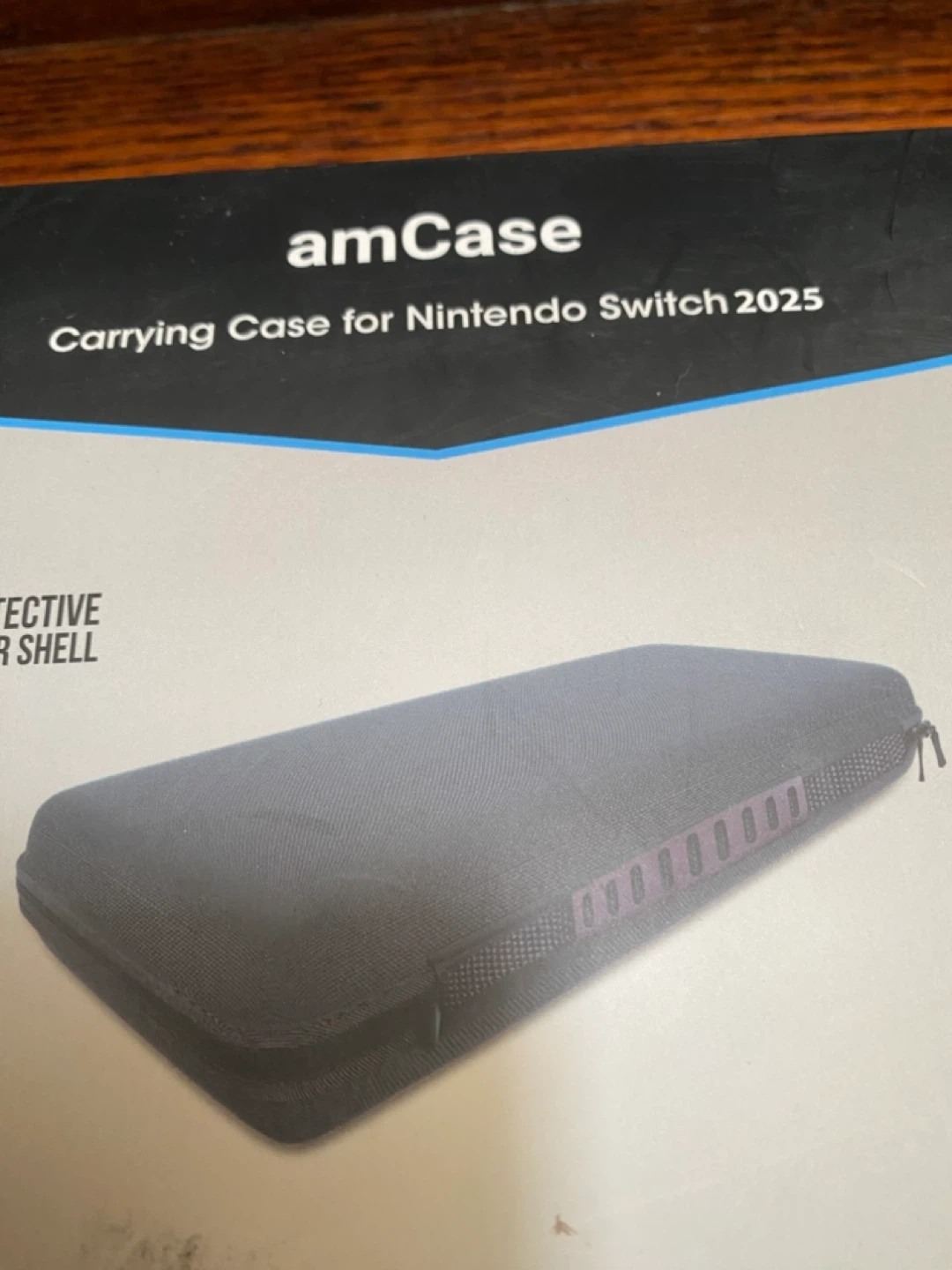 This amCase carrying case is designed for the Nintendo Switch 2025. It features a hard outer shell and a mesh storage pocket. Includes elastic straps for security and a wrist strap. It also has game cartridge pockets inside!