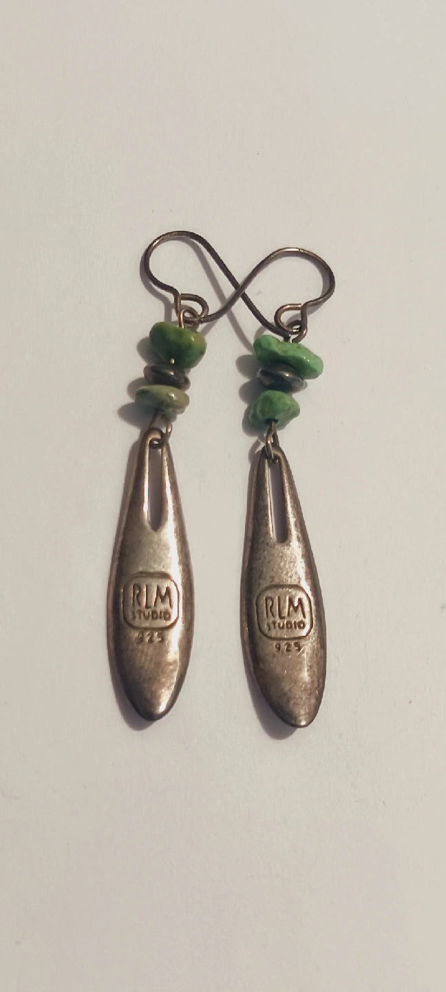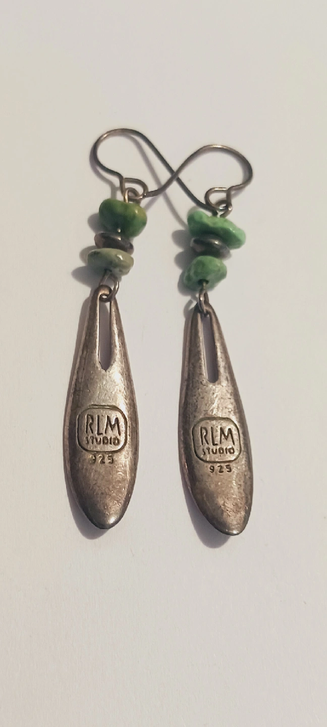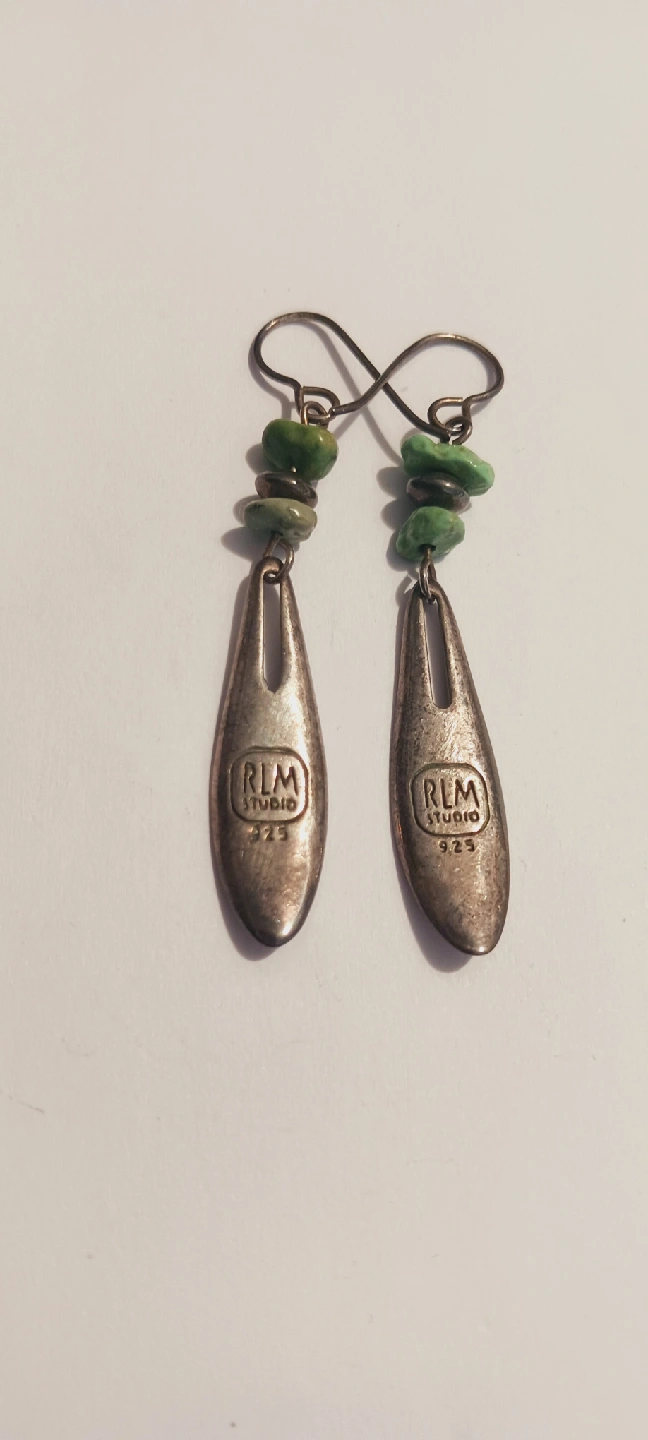 1000+ROBERT LEE MORRIS RLM Studio 925 Designer Signed Sterling Silver 925 Turquoise Dangle Earrings. The earrings also have green stones. 2.5" long. Excellent condition. ALL MY PRICES ARE NEGOTIABLE !!