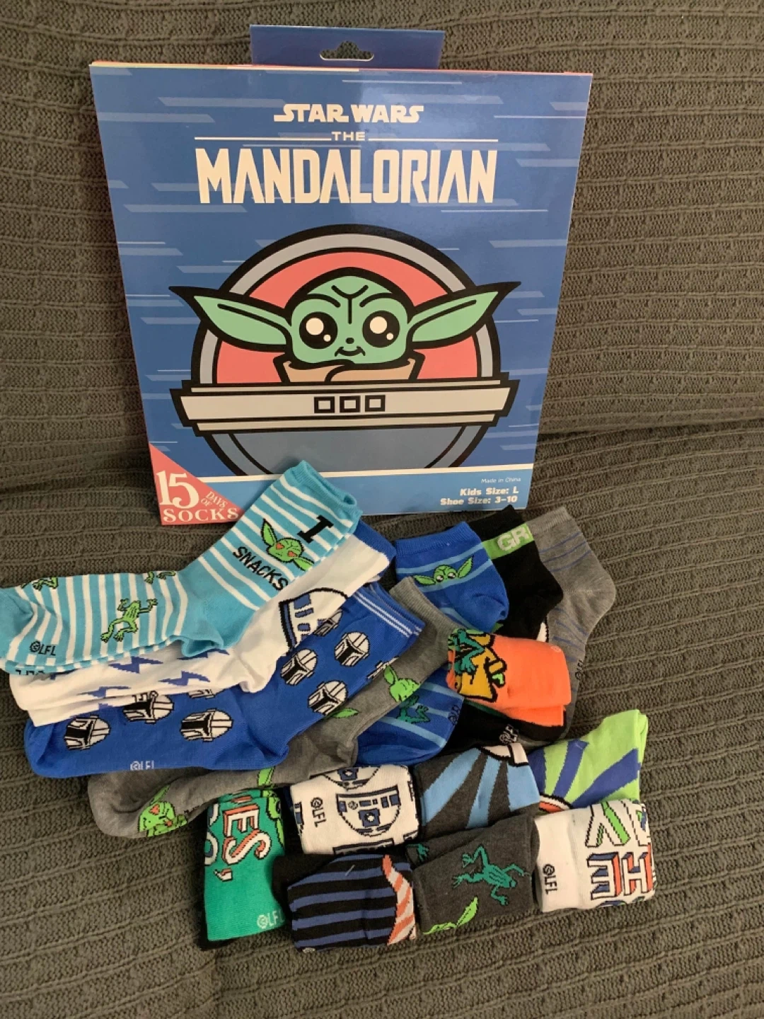 This is a 15-pack of Star Wars The Mandalorian themed socks. They are kids size Large with a shoe size range of 3-10. Various fun character designs are included in the pack!