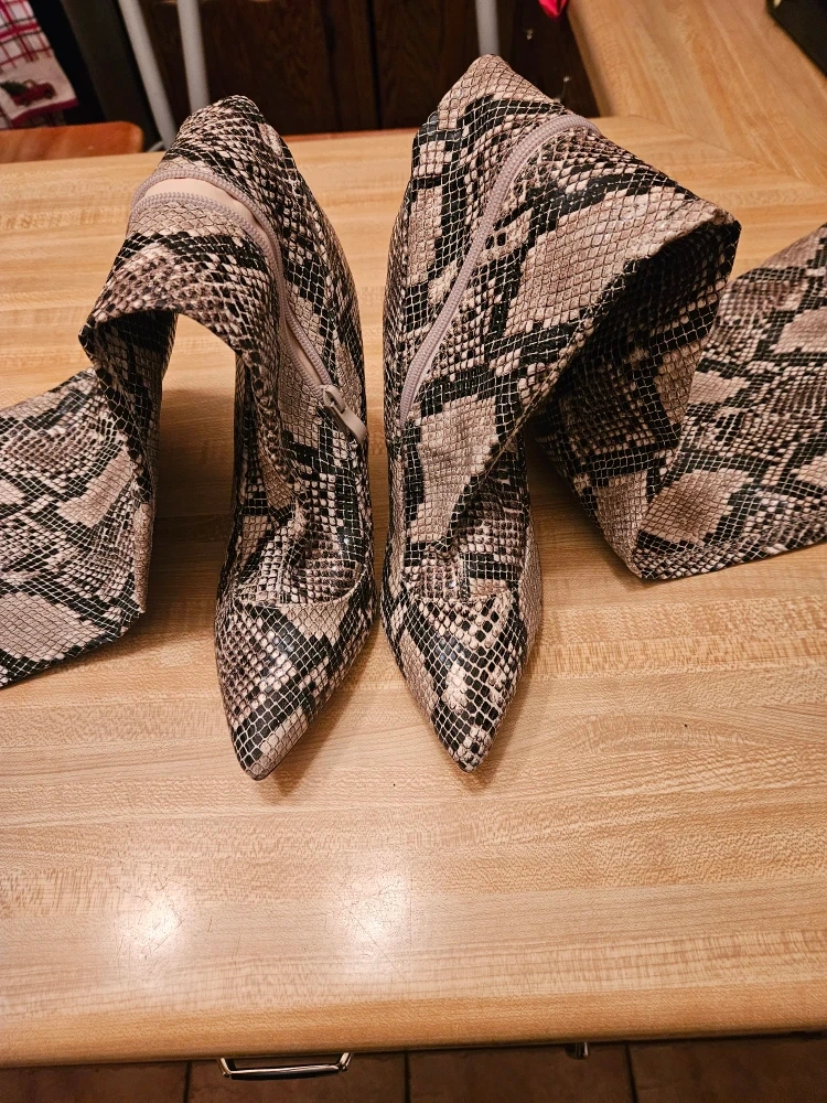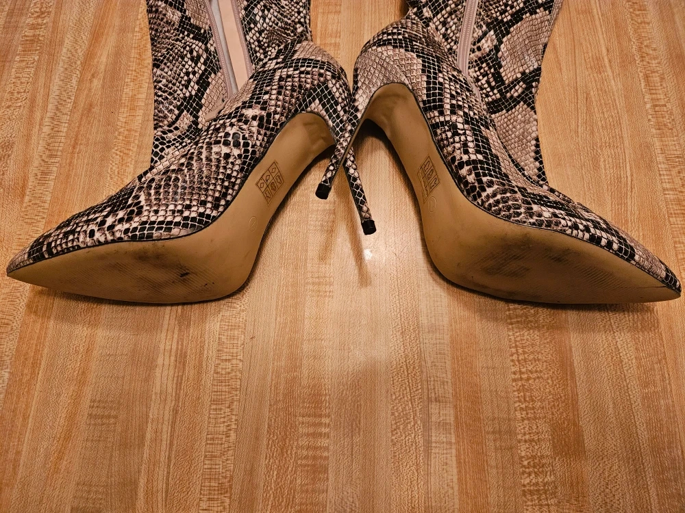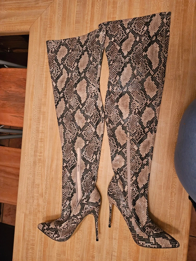 Selling a pair of snakeskin print thigh-high heel boots. They have a stiletto heel and a side zipper. Great for a night out!