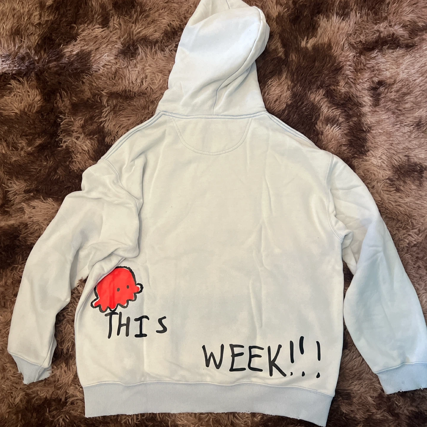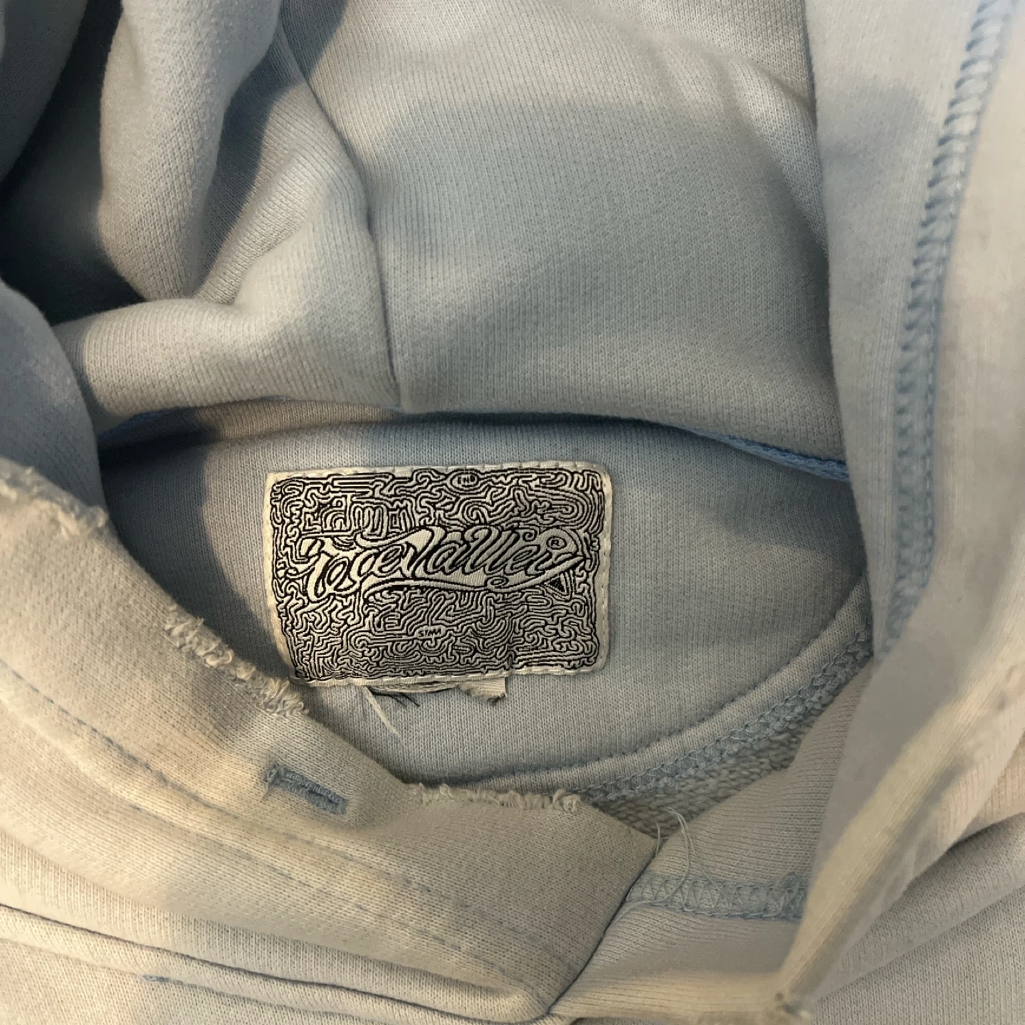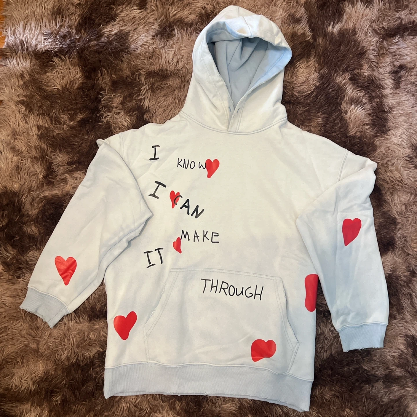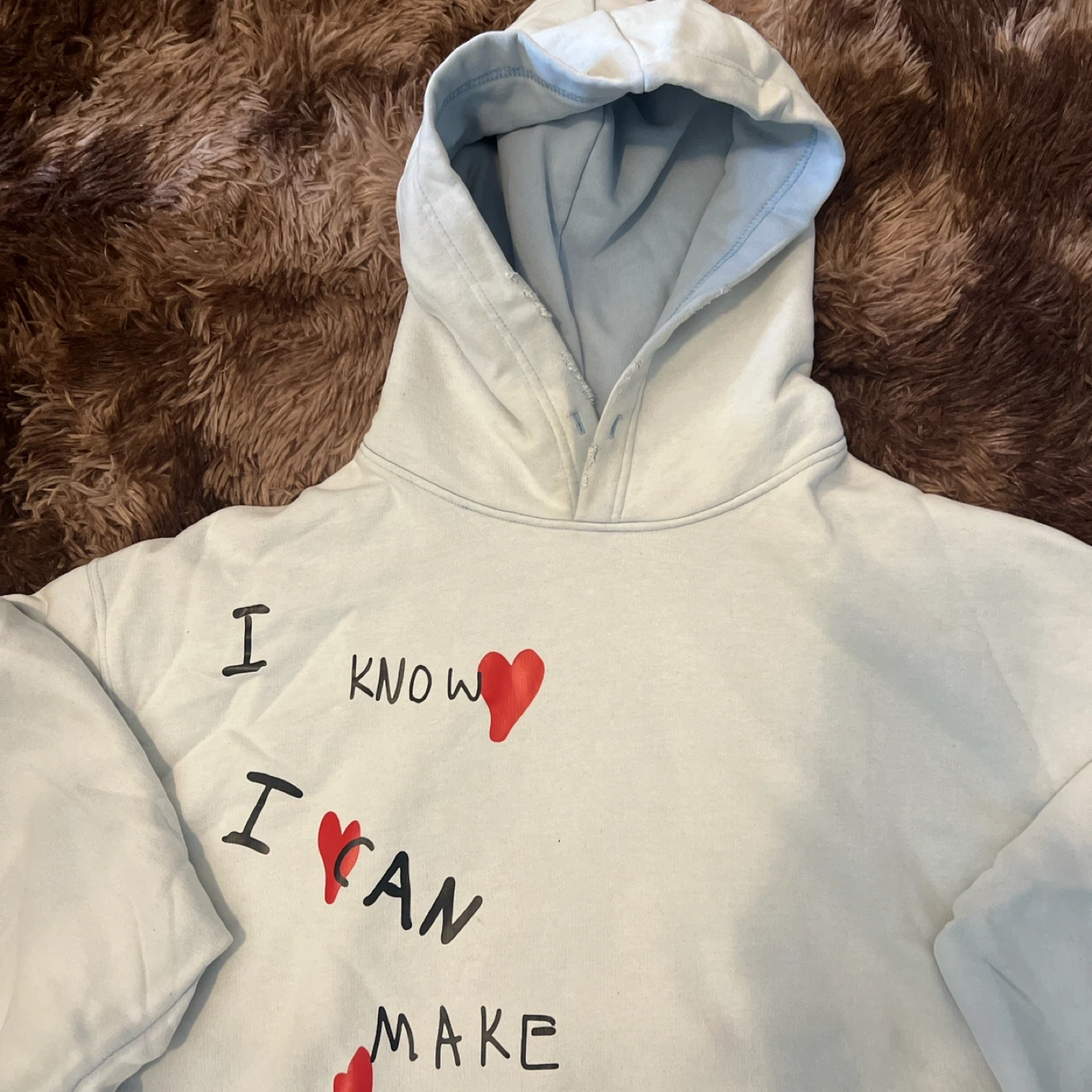 Selling a light blue Roger Miller hoodie. It has a unique design with red hearts and handwritten text. The hoodie is in good condition and it’s baggy for hoodie szn!