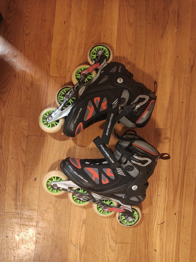 Selling a pair of Rollerblade inline skates! They feature a black, gray, and red color scheme with bright green wheels. Great for recreational skating and staying active