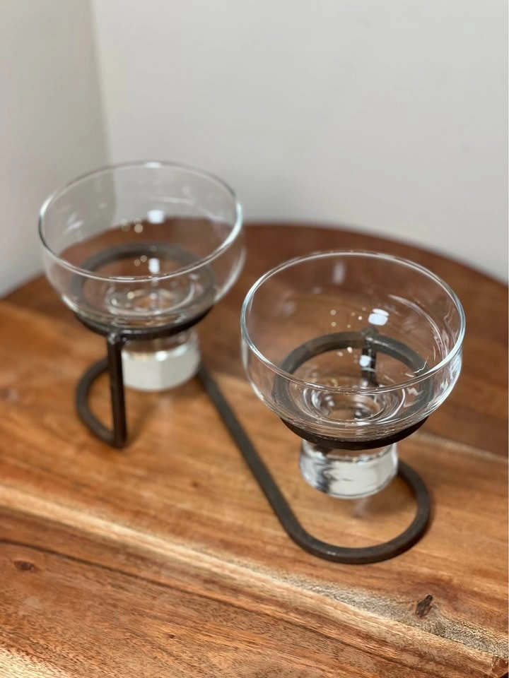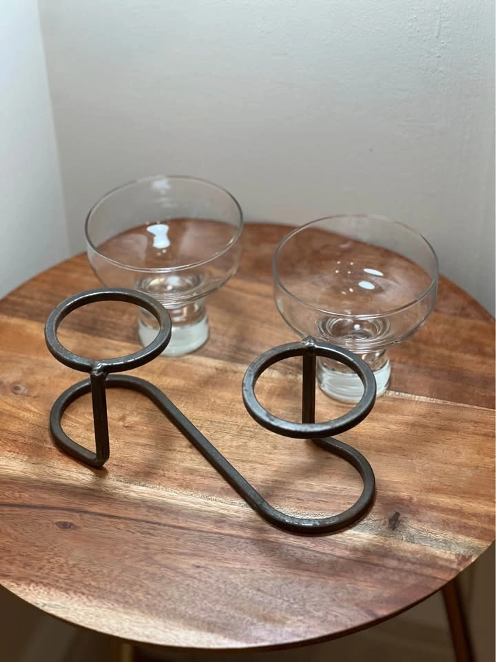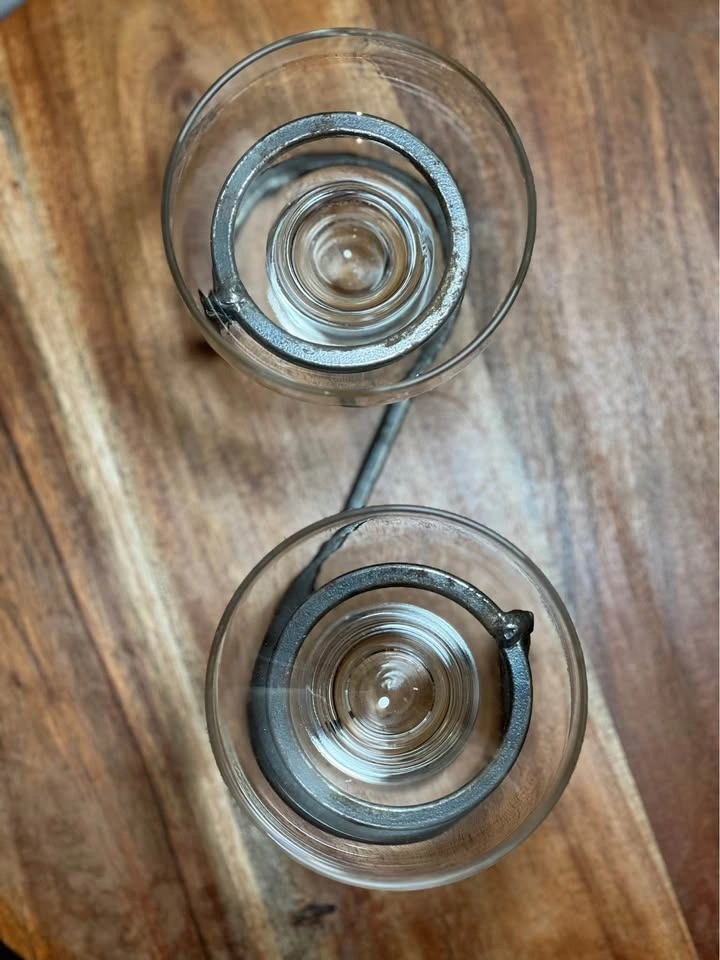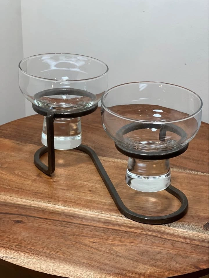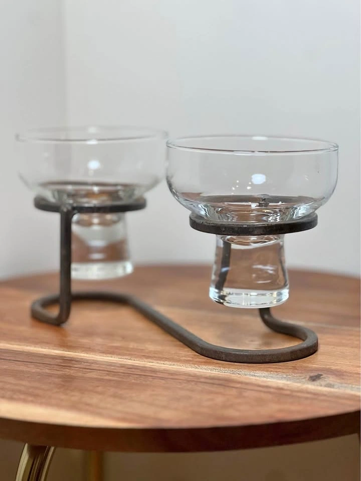 This is a preowned Danish mid-century modern candle holder, likely from the 1960s. It features a minimalist wrought iron base and two thick glass inserts suitable for votive or tea light candles. The geometric Scandinavian design is characteristic of the era, with some similar pieces attributed to manufacturers like Durobor or in the style of Erik Höglund. Pickup is at 58th and 7th Ave in Midtown Manhattan.