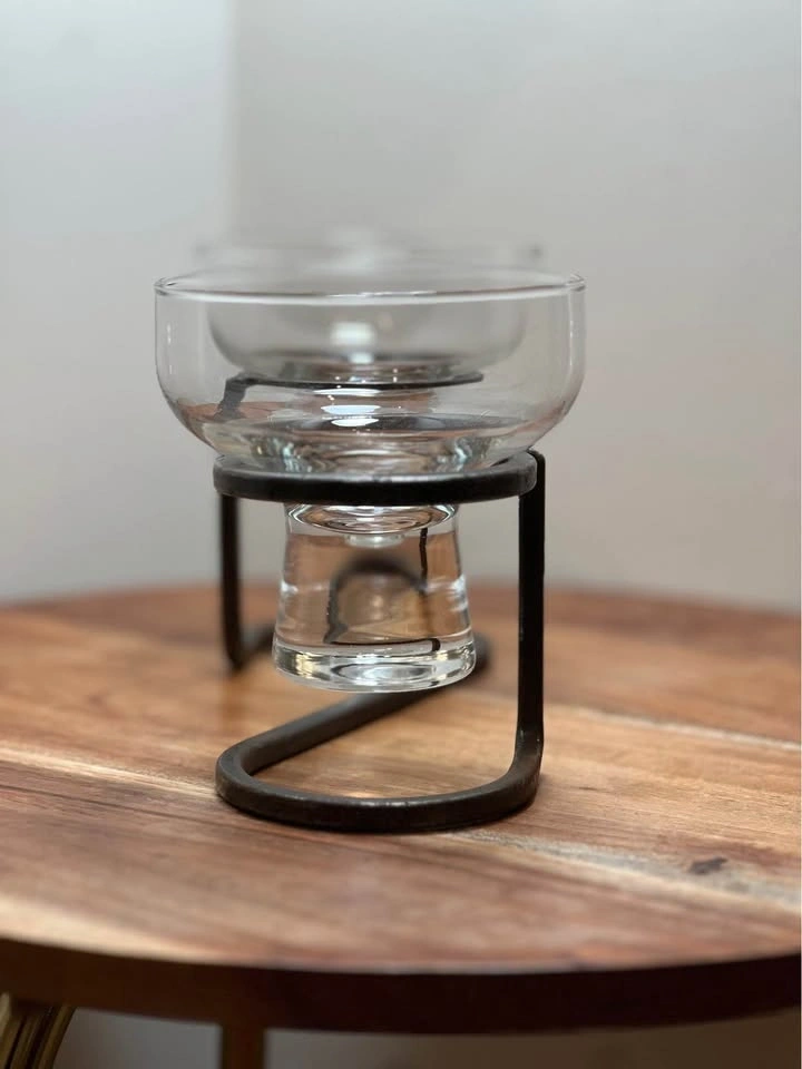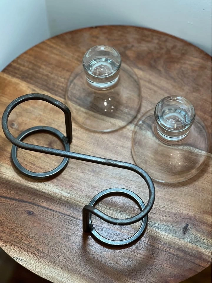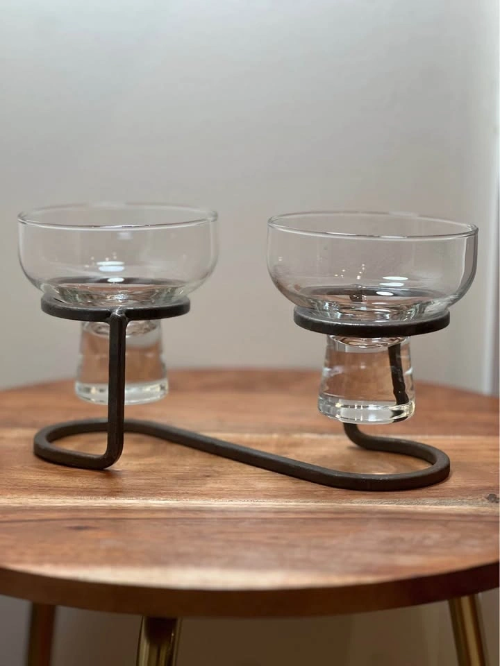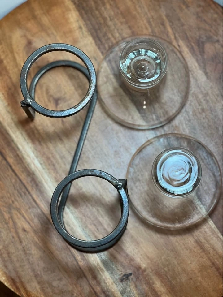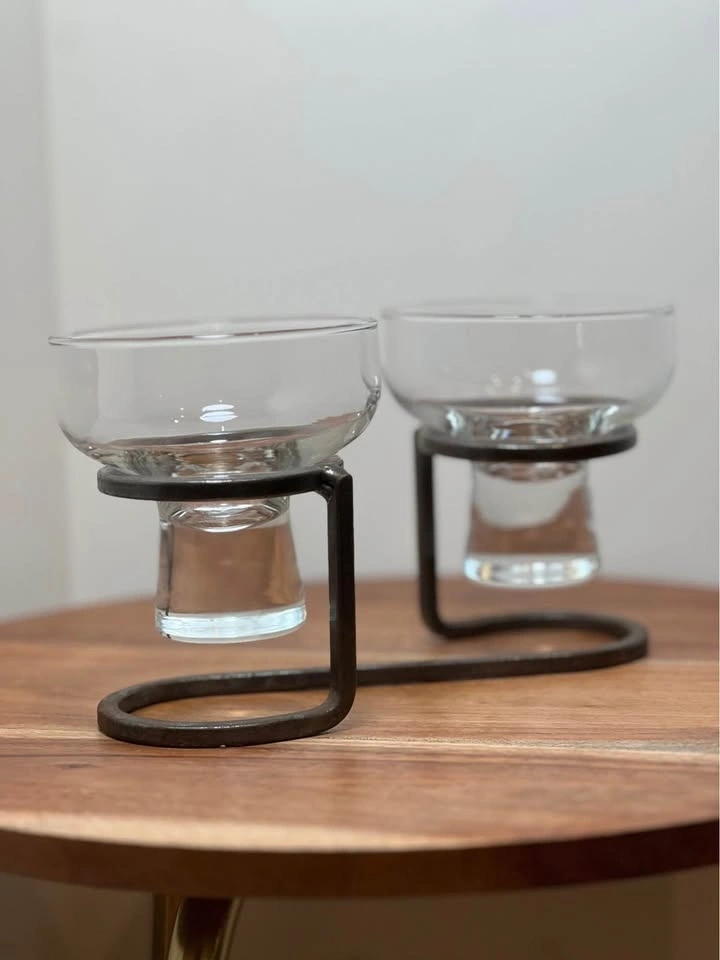 This is a preowned Danish mid-century modern candle holder, likely from the 1960s. It features a minimalist wrought iron base and two thick glass inserts suitable for votive or tea light candles. The geometric Scandinavian design is characteristic of the era, with some similar pieces attributed to manufacturers like Durobor or in the style of Erik Höglund. Pickup is at 58th and 7th Ave in Midtown Manhattan.