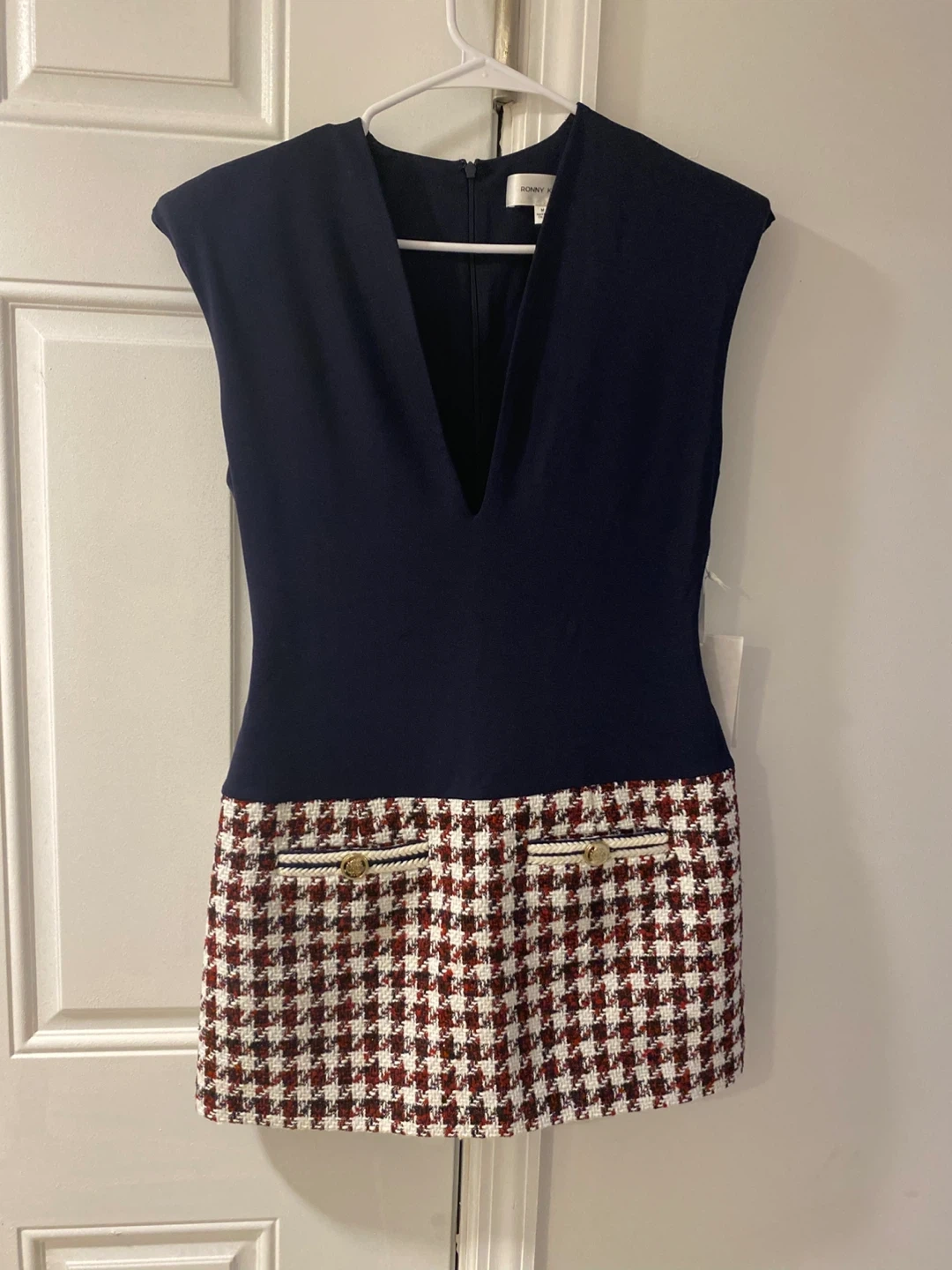 Selling a Ronny Kobo mini dress. It features a navy blue top and a houndstooth patterned skirt. Great for a chic, stylish look!