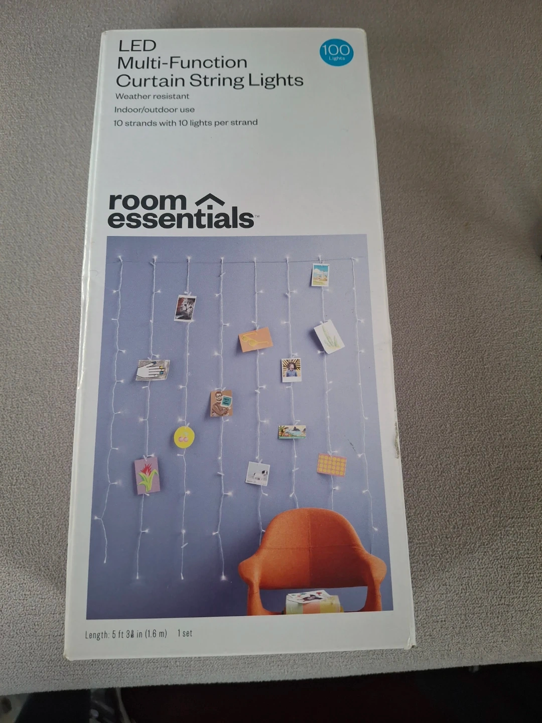 60I'm selling a Room Essentials LED Multi-Function Curtain String Lights! It's weather resistant and can be used indoor or outdoor. There are 10 strands with 10 lights per strand. The length is 5 ft 3/4 in (1.8 m).