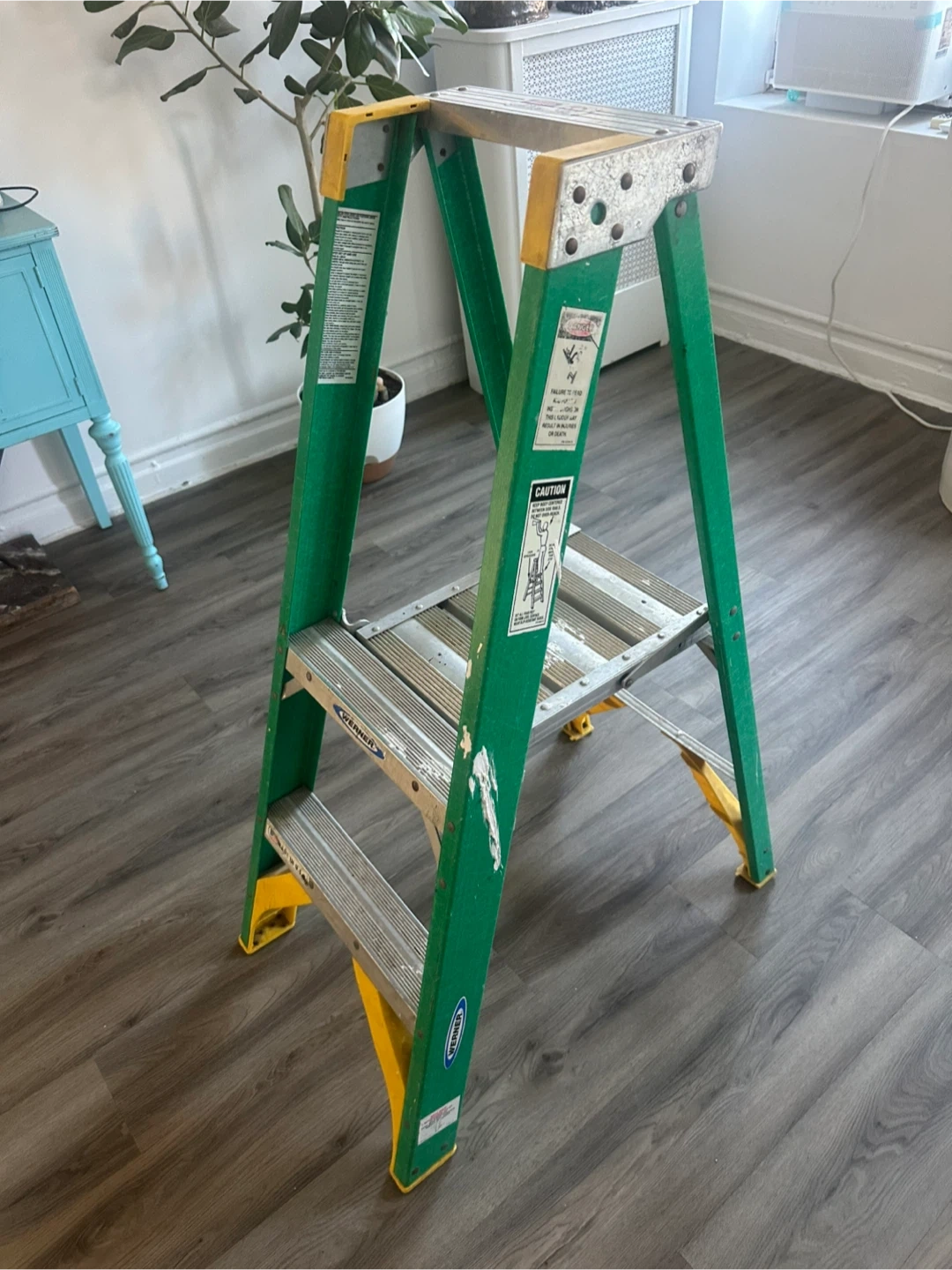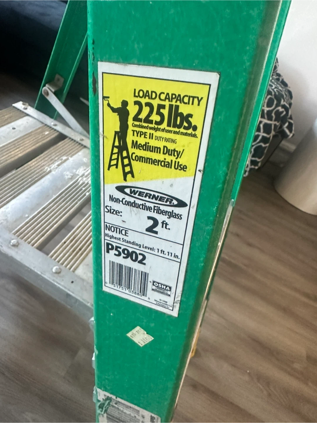 Werner non-conductive fiberglass step ladder. 2 ft. size. Load capacity 225 lbs. Type II duty rating. Medium duty/commercial use. Highest standing level 1 ft. 11 in.